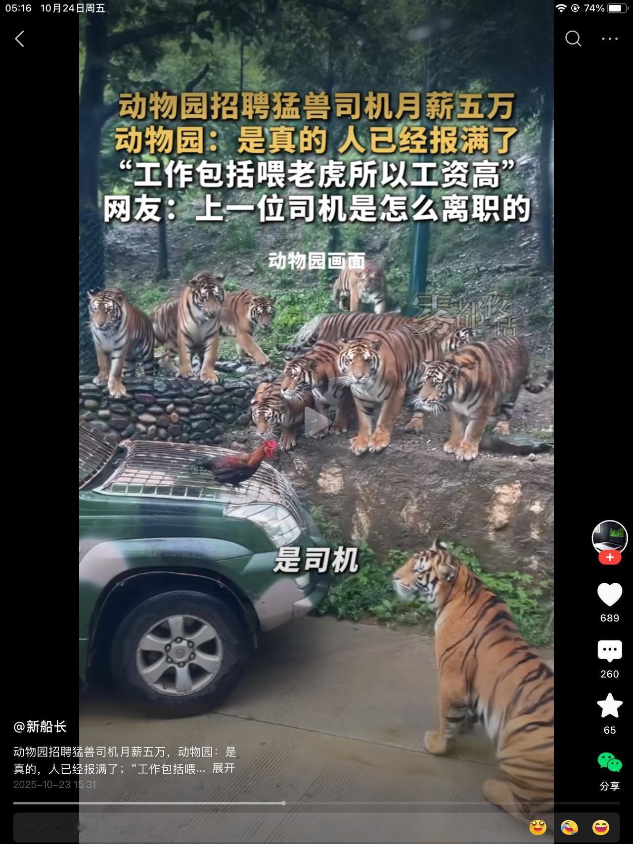 动物园月薪五万招聘司机,工作内容包括喂老虎。网友操心:上一位司机是怎么离职的?工作内容是喂老虎?不是亲自喂了老虎吧? 哎呀妈呀,不能弄个机关吗?让投喂变得简单?网友也说了,那就不是五万是五千了。五千谁干,五万能干。跟下井挖煤一个性质。 挖煤还赚不到五万。同样是把脑袋别在裤腰带上。老百姓还是挺难的。