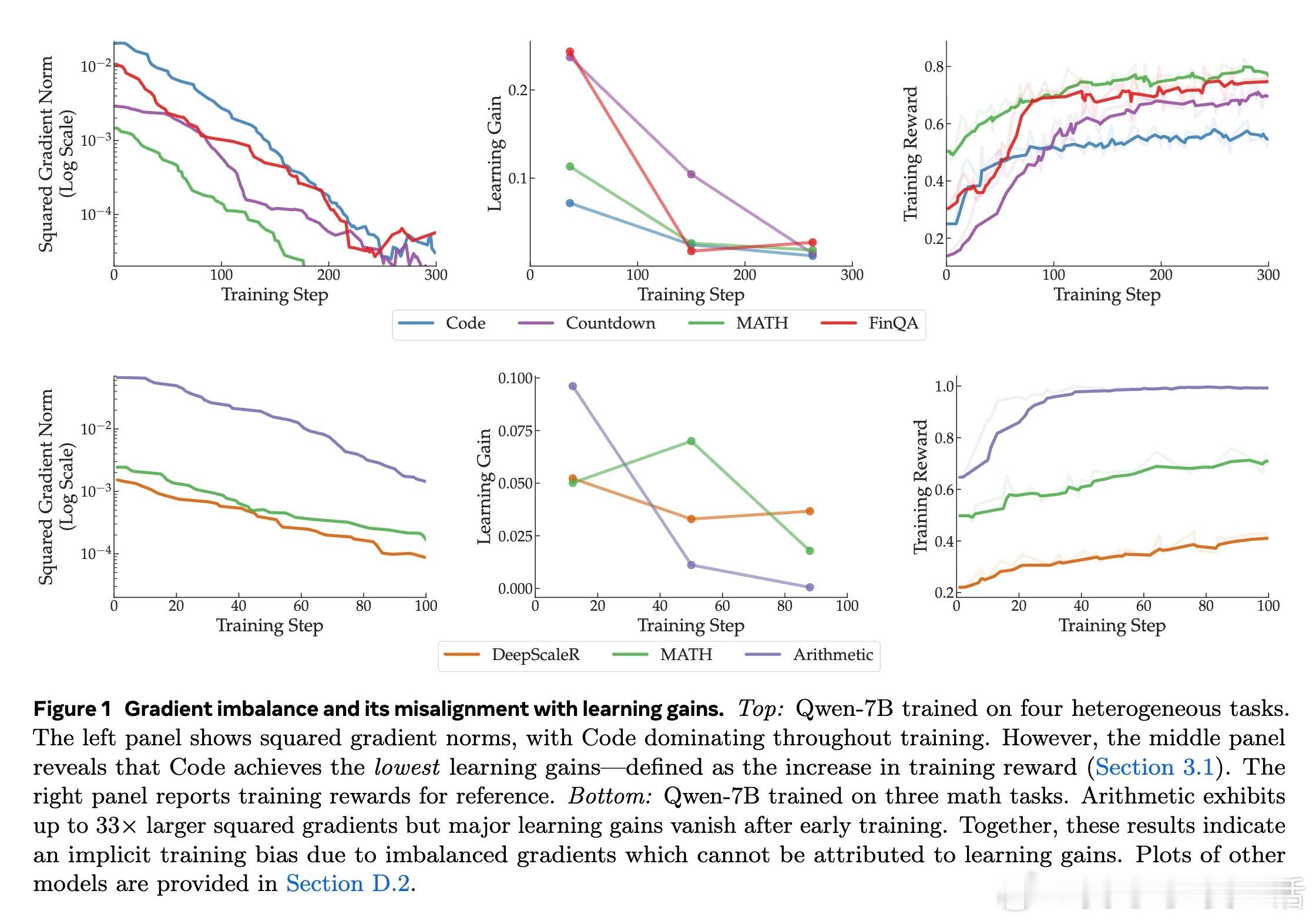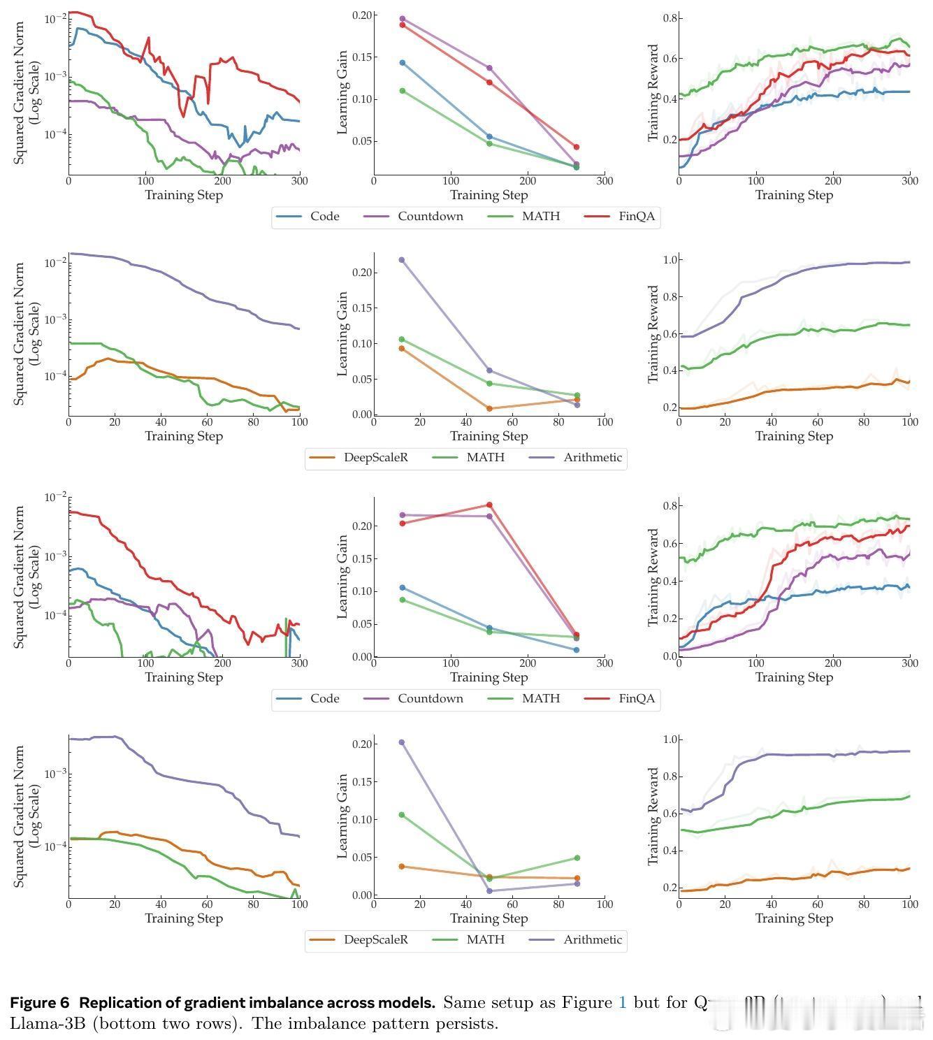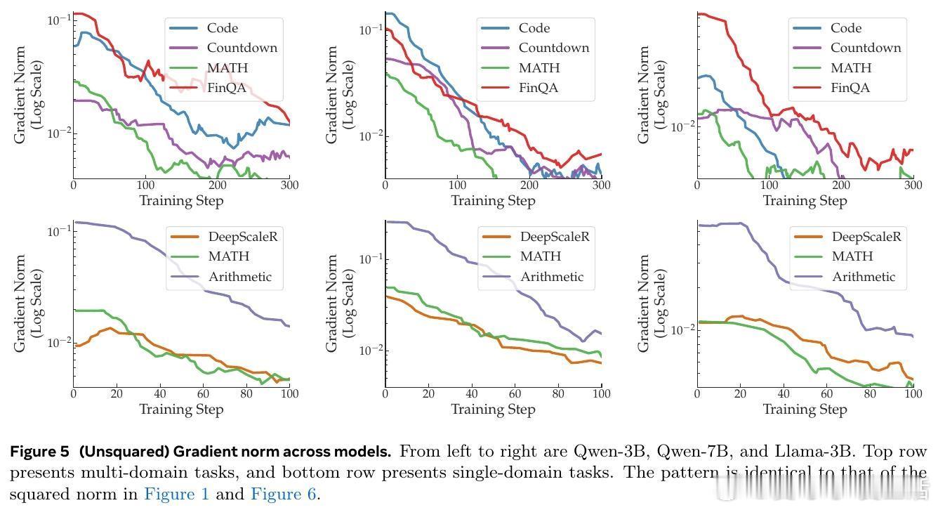 - 多领域任务:包括代码生成(Code)、数字构建(Countdown)、数学问题求解(MATH)和金融推理(FinQA)。结果显示,Code任务的平方梯度范数可达MATH的15倍,主导整个优化过程。