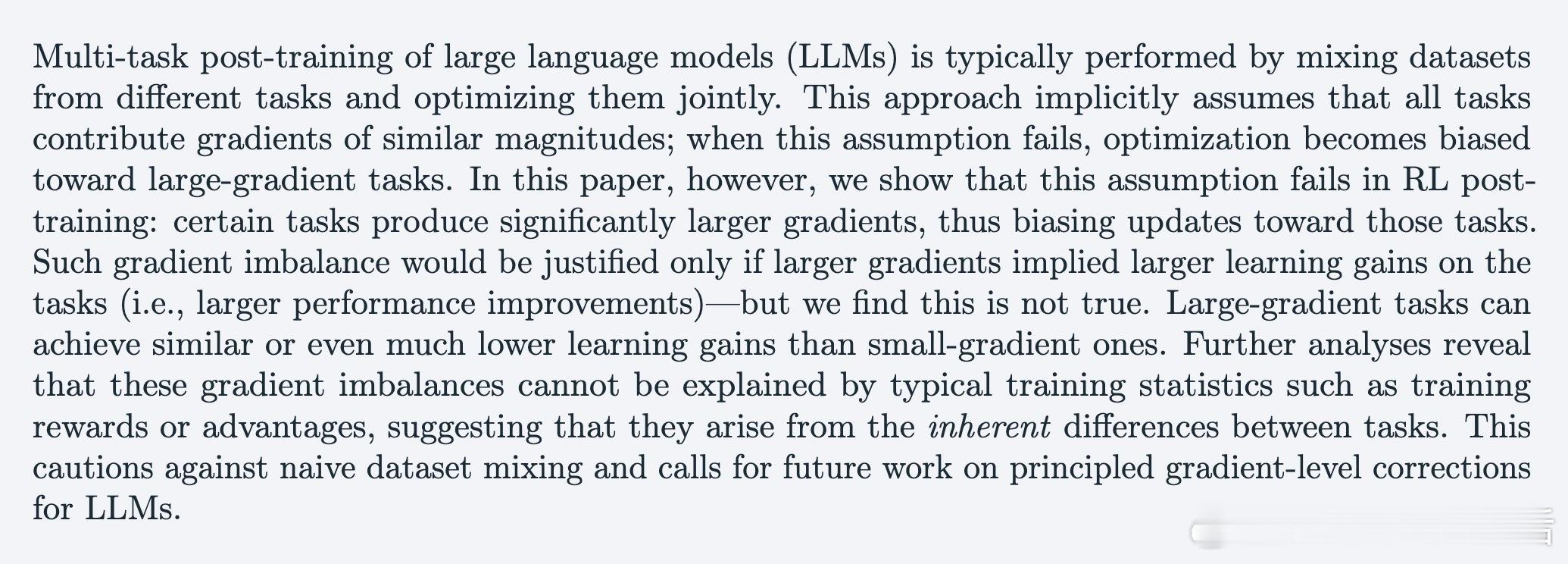 在大型语言模型(LLM)的多任务学习中,我们常常通过混合不同任务的数据集进行联合优化,以实现跨领域泛化。但这项新研究揭示了一个隐忧:在RL后训练阶段,梯度不平衡现象普遍存在,可能导致优化偏向某些任务,损害整体性能。