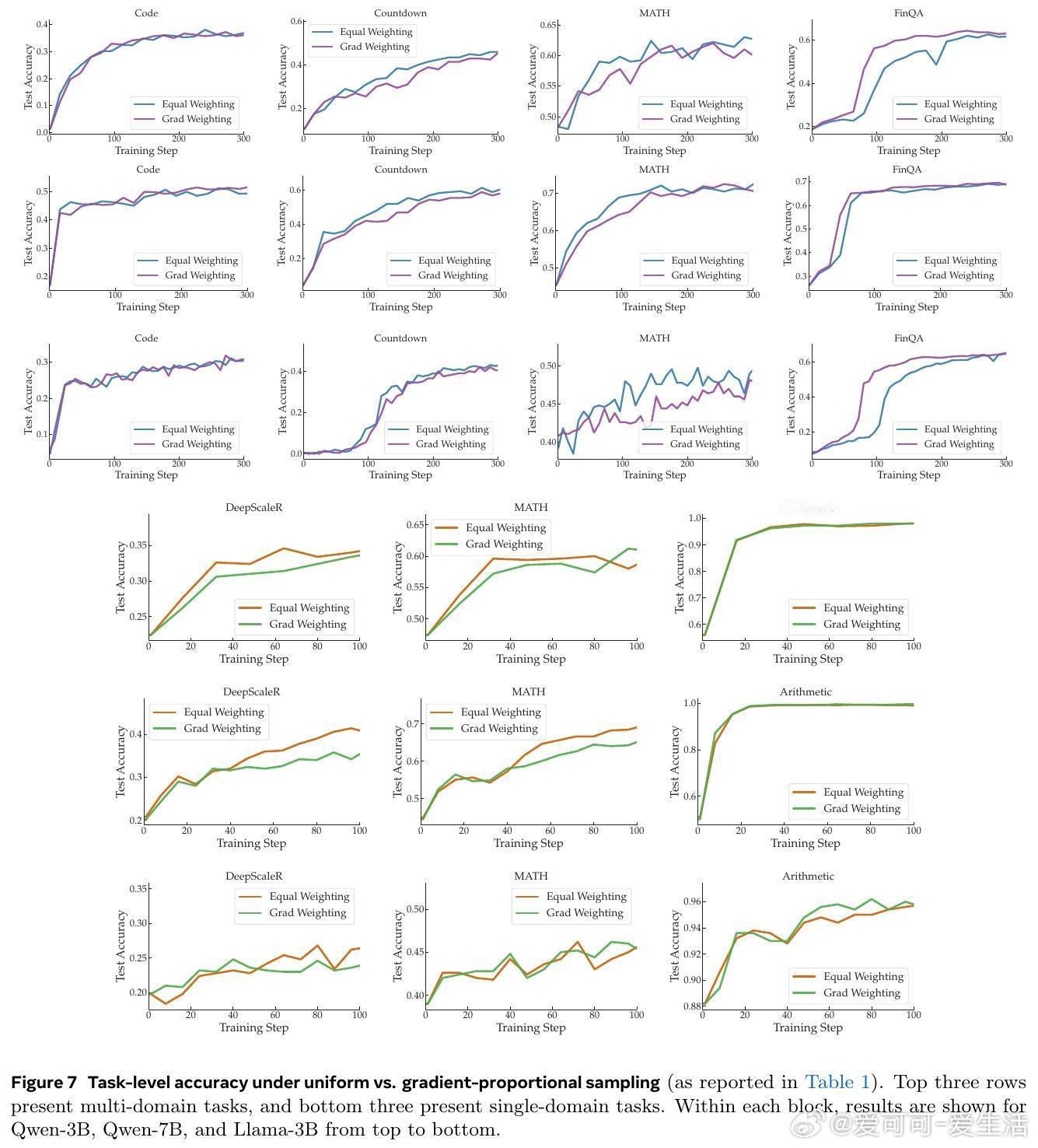 - 梯度比例采样实验:不是均匀采样,而是按梯度幅度softmax采样(最低10%概率避免卡住)。结果:在Table 1中,Qwen-7B多领域平均准确率从61.97%降至60.48%;单领域从69.67%降至66.00%。大梯度任务(如FinQA、Arithmetic)准确率略升,但整体平均下降,证明优先大梯度会牺牲小梯度任务,误导训练。