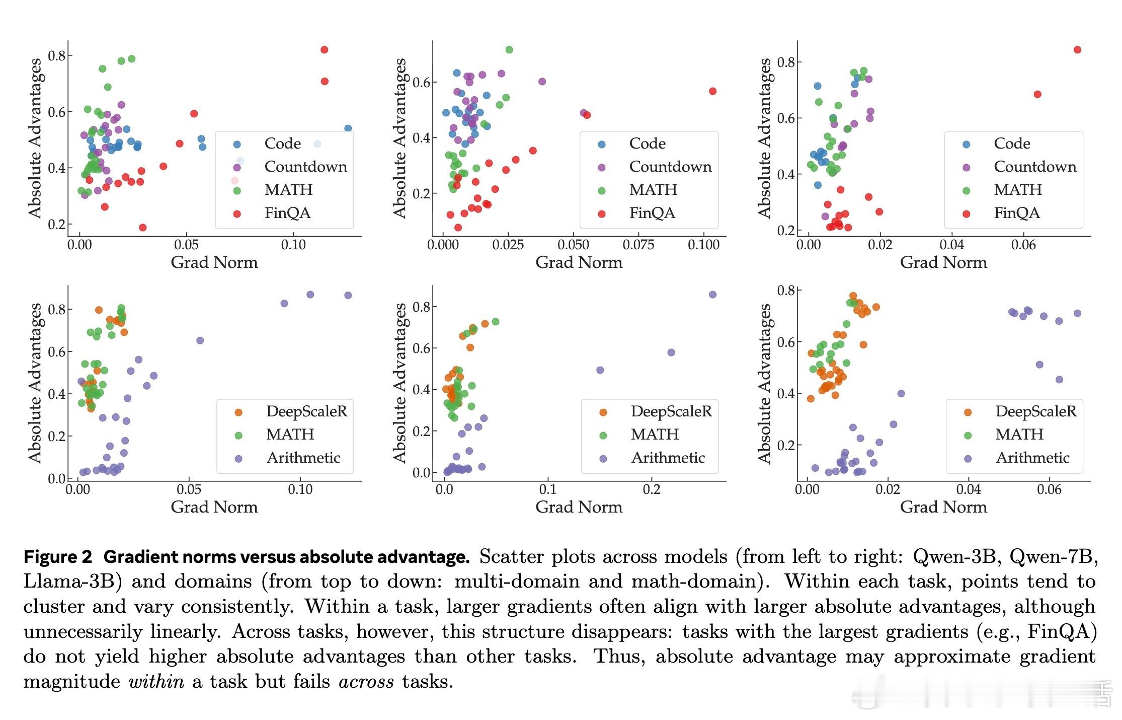 - 优势函数(Advantage):政策梯度定理暗示|A|近似梯度幅度(Jensen不等式)。散点图(Figure 2)显示,单任务内正相关,但跨任务失效——同等|A|下,FinQA梯度远大于MATH。