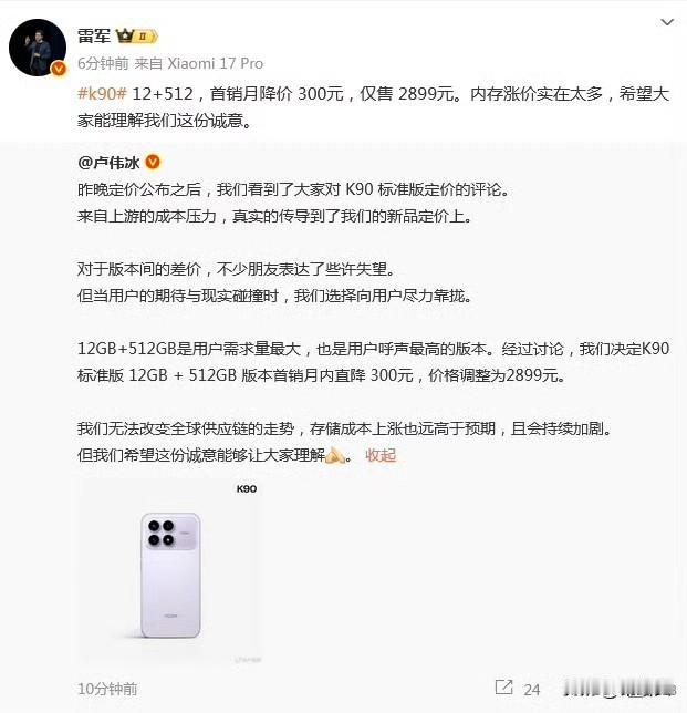 雷军急了!K90定价遭吐槽,内存涨价到这地步?真相太意外 红米K90刚发布就炸锅了,高配版差价直奔1400元,网友骂“性价比没了”,雷军赶紧发文解释:内存涨得太狠,真心望理解,这事儿没那么简单。 争议全出在版本差价上。12+256GB版2499元,塞了骁龙8 Elite芯片和7100毫安电池,比同配置小米17便宜2000块,看着特香。 可一往上升级就不对劲了,标准版升到16+512GB要多花900元,Pro Max版差价更是飙到1300多,比上代K80 Pro贵出一截,难怪大家不买账。 卢伟冰早先说过,存储成本涨得远超预期。这话真不是甩锅,现在DDR4价格比年初翻两倍,16GB内存条都突破500元,存储芯片成了“理财产品”。 上游供应商才是幕后推手。三星、美光这些大厂全在涨,加上AI热潮抢芯片,存储供需彻底失衡,有分销商说客户都在双倍下单抢货,价格能不疯涨吗? 不光红米,整个行业都在扛压力。小米15、荣耀Magic7起售价都涨了,真我副总裁直言,高配存储成本太高,连低配版都在亏钱卖,实属无奈。 雷军也没硬扛,直接给12+512GB版首销降300元,2899元就能拿下,这版本还是用户需求量最大的,等于自己吞了部分成本,诚意确实看得见。 有人骂贵,也有人觉得值。Pro Max版的光影猎人950主摄、5倍长焦都是旗舰配置,懂行的知道这是实打实的成本,不是瞎涨价。 教大家个选机招:预算有限就选12+256GB标准版,2499元能拿下九成旗舰体验;想要影像和大存储,等双十一,说不定能叠加补贴再降几百。 别光骂厂商涨价,得看清楚根源。存储芯片涨价是全行业难题,不是某家故意抬价。厂商能做的,就是在成本和性价比之间找平衡,这已经不容易。 雷军和卢伟冰敢说实话,还主动降价,比那些默默涨价的品牌实在多了。毕竟消费者要的不是低价,是明明白白的定价和诚意。 你觉得K90这定价能接受不?要是换你,会选便宜的标准版,还是加钱上高配?评论区聊聊,给纠结的大伙儿指条道。