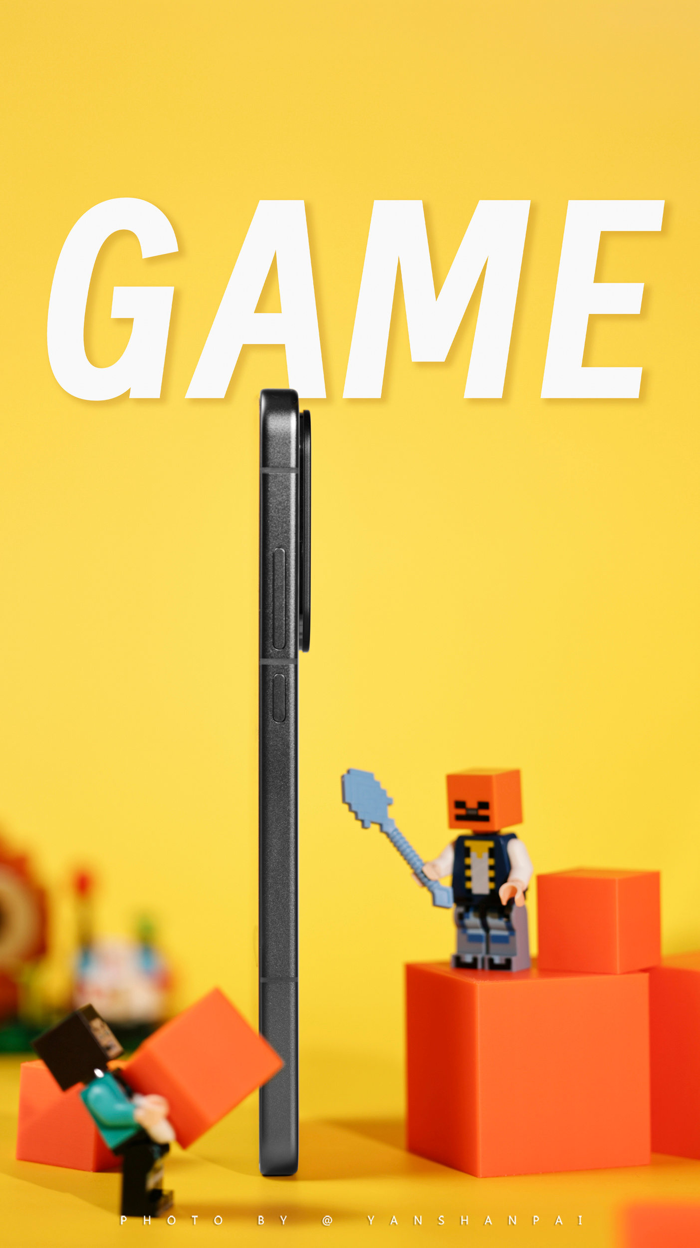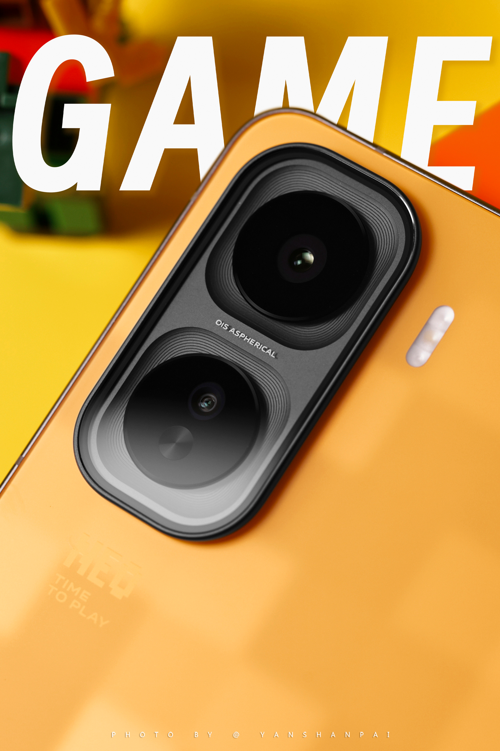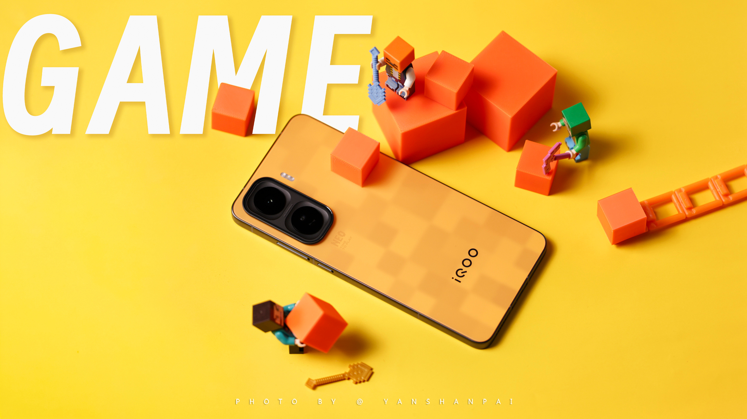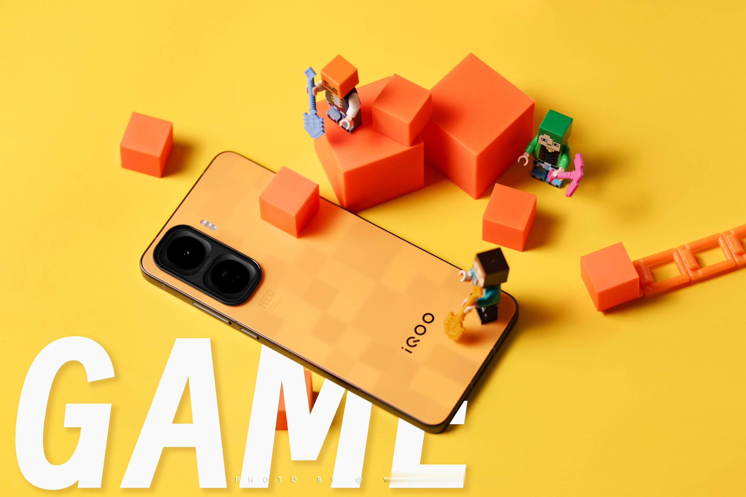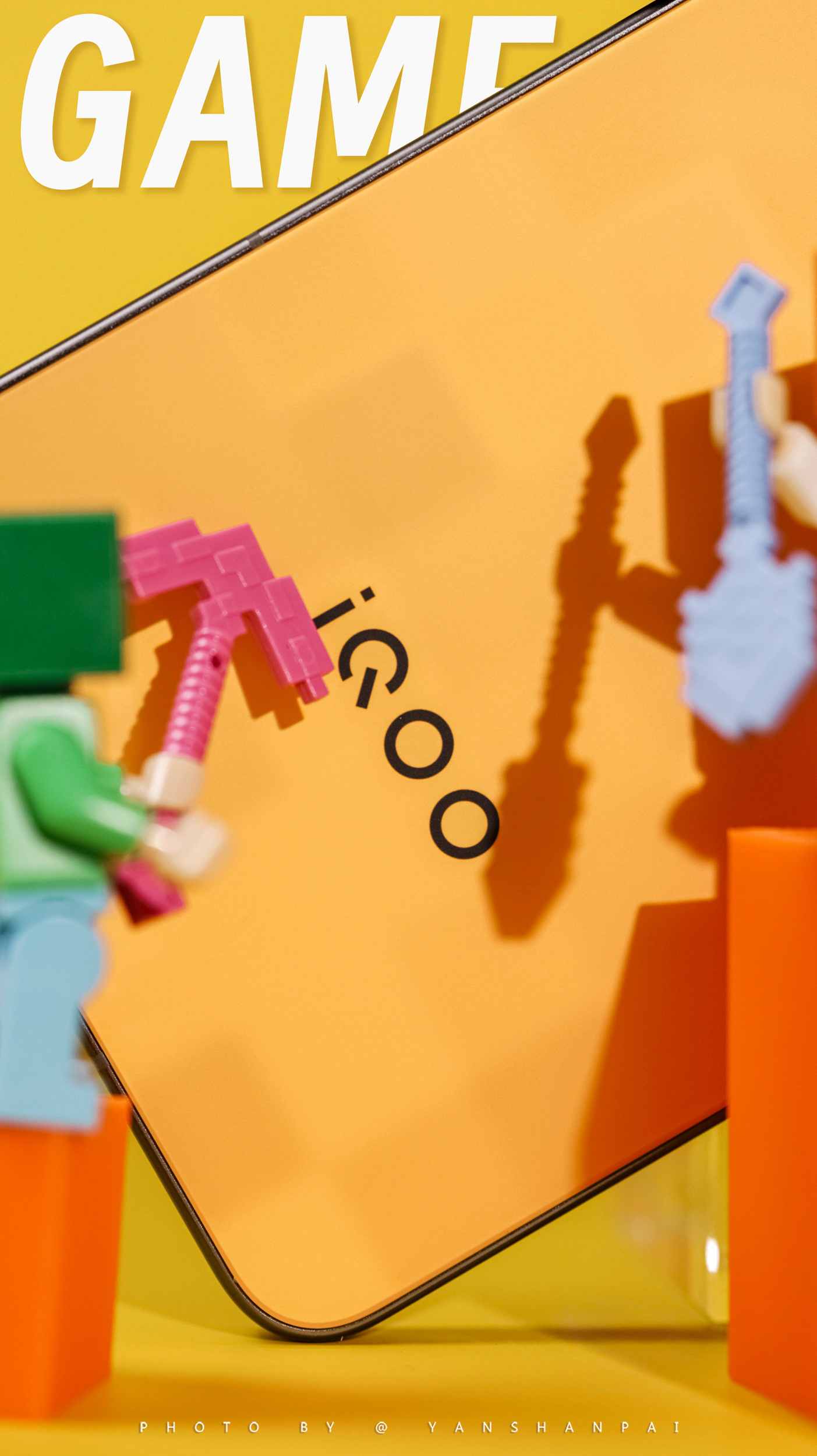 这款配色的设计灵感就是致敬8bit像素游戏文化的,哑光质感下78个橙色方框形成的光影效果很特别,一眼让我想起了曾经爱玩儿的8bit游戏,而且还有一种让iQOO Logo悬浮起来的效果。