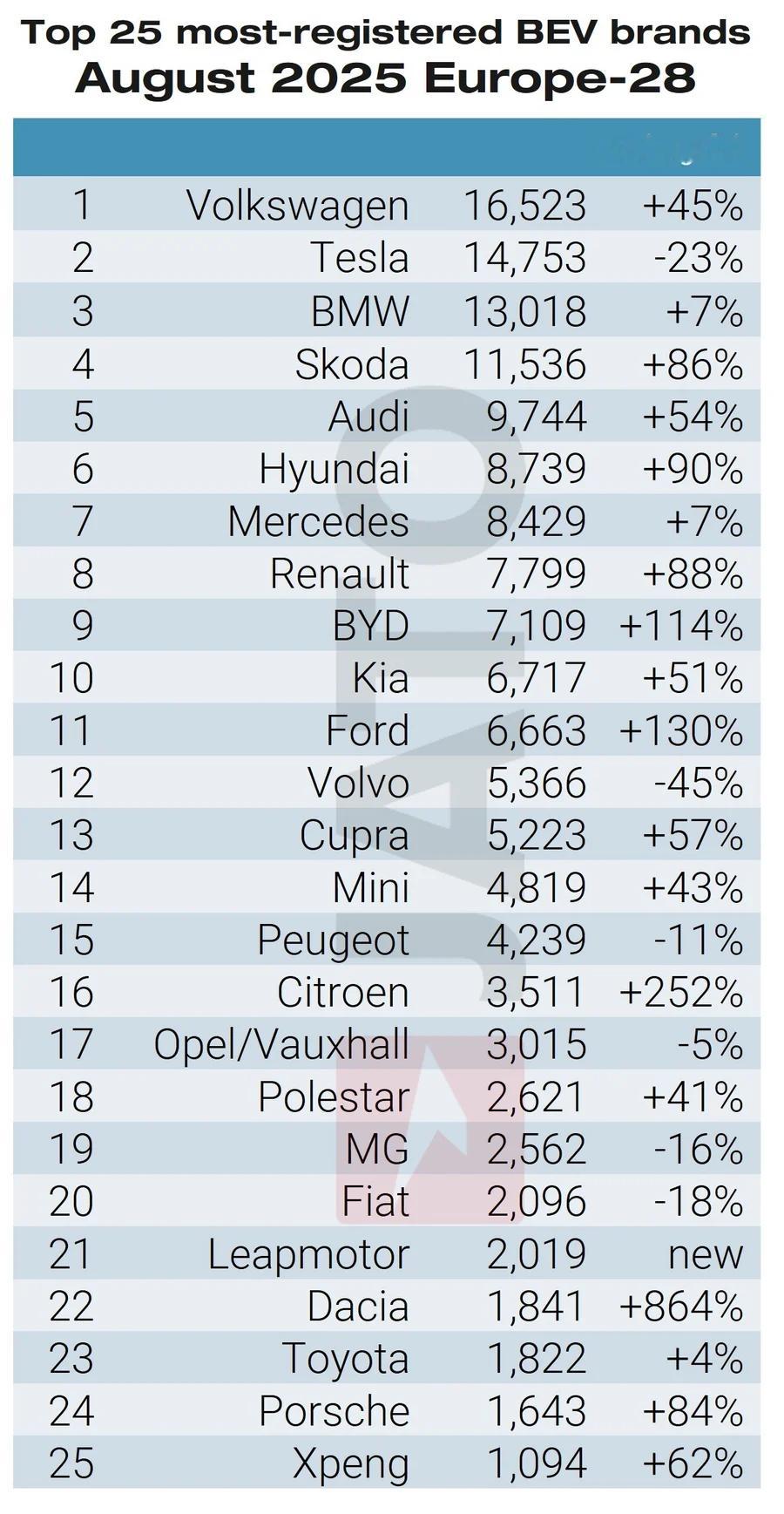 图1:9月欧洲28国纯电top25销量-品牌:BYD、沃尔沃、极星、MG、零跑、小鹏