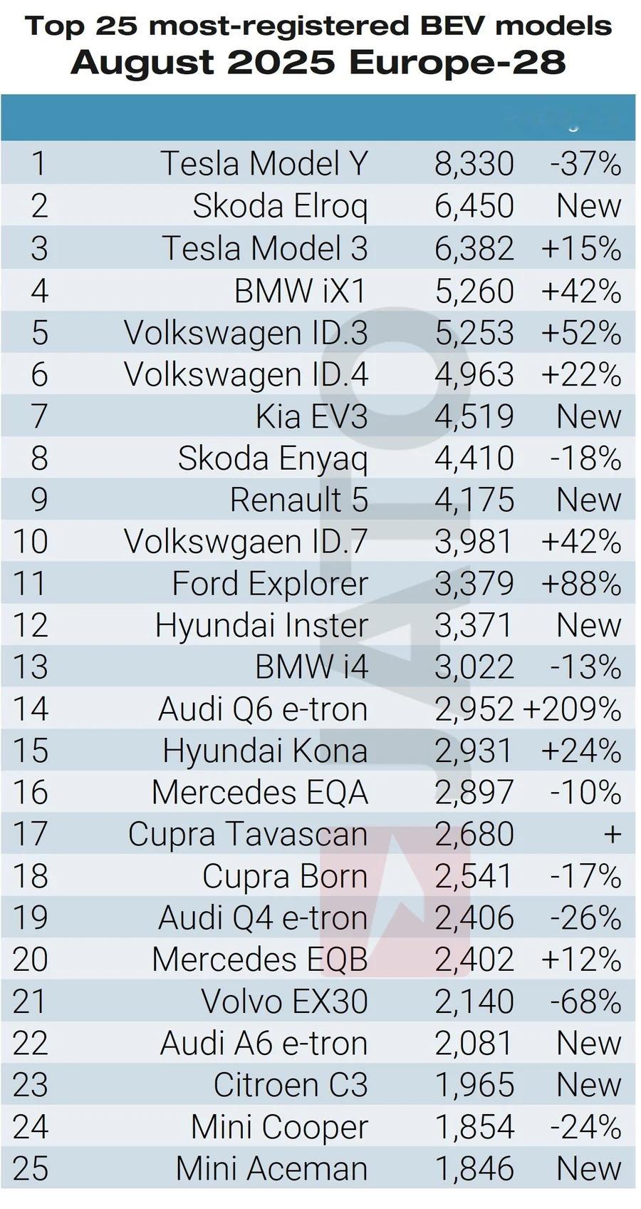 图2:9月欧洲28国纯电top25销量-车型:沃尔沃EX30