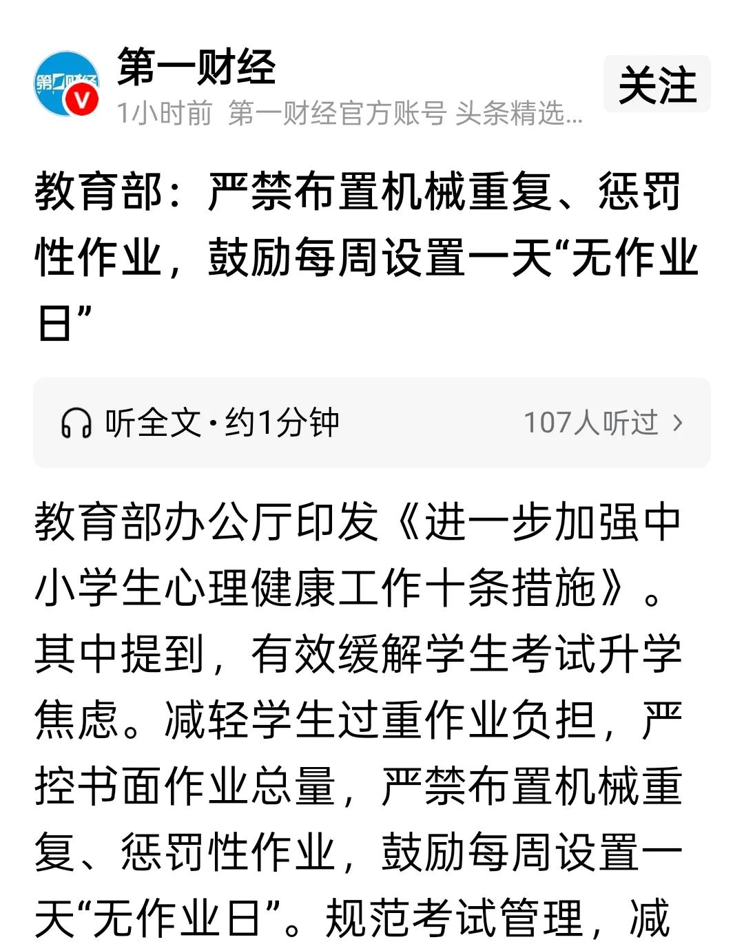 这是孩子家长群发的作业,让我很是无语 虽然我家孩子也只抄一遍,但是看到这样的分层作业也着实让人心里不痛快 教育部都明确说了,严禁布置机械重复的惩罚性的作业,但是你看还是在抄写,最多的一个抄写10遍。 我闺女抄了一遍,大概还需要了10分钟时间,如果那个抄写10遍认真完成的话,怎么着也得一个多小时 这不就是惩罚性的作业吗?这不就是机械重复性的作业吗? 我看了一下这个作业的内容,就是很基础的一些东西,抄写重点的字词,还有课下的作者注释等文学常识等等 但是语文今天的中高考早就告别了这种机械性的考法了,都是以阅读理解为主。这作业布置的,还不如让学生上传读名著的视频音频呢。 作业是应该布置的,帮助学生掌握基本的学习内容啊,数学也好啊,其他的科目也罢,通过做题让学生掌握住知识,这是应该的,但是像这种抄写性的作业实在没有太多的必要,而且又不是什么重点考点。 就感觉像这样作业的布置,根本就不是为了学生学习成绩的提高,而是为了树立老师的权威,是为了惩罚那些达不到要求的孩子,这其实是背离了教育的初衷。