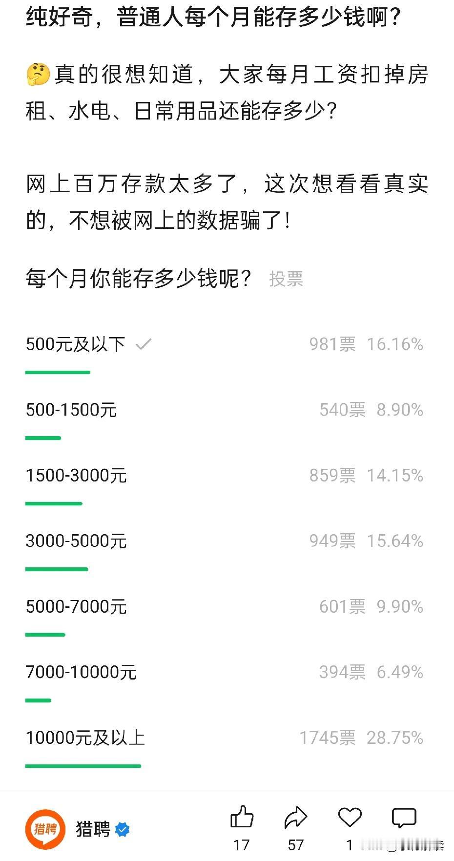 你每个月能存多少钱?能留言让我看看各位网友的实力吗? 刚刚看到猎聘网发的一个投票,我投了500以下,实际上是因为没有负数,不然我肯定投入入不敷出[狗头] 这里面居然最高的是图片最下方的数字,看来网上人均富豪果然传言不假[狗头]