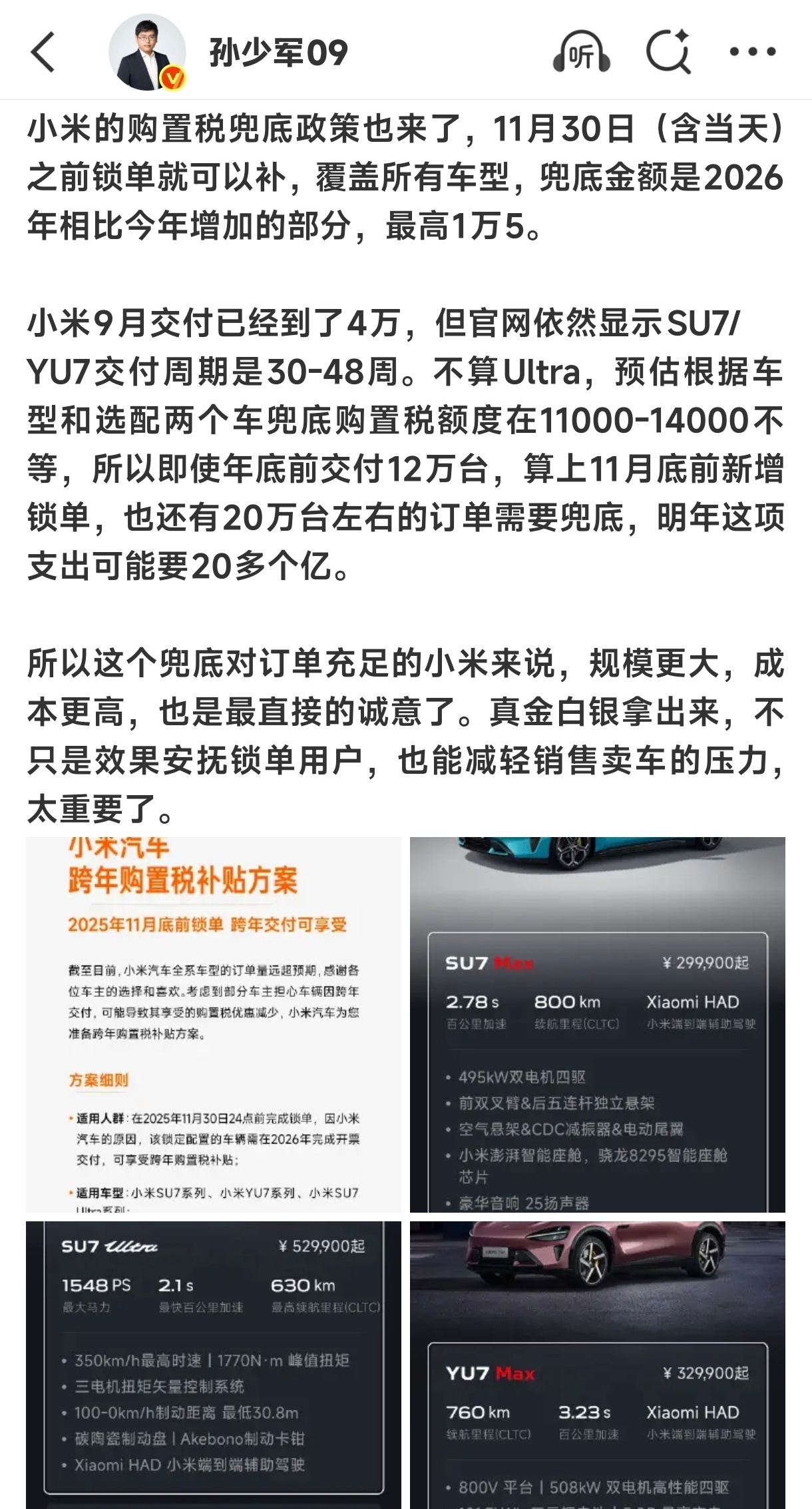 20个亿呐兄弟们!小米今天官宣了兜底购置税的方案 小米推出全系购置税补贴方案