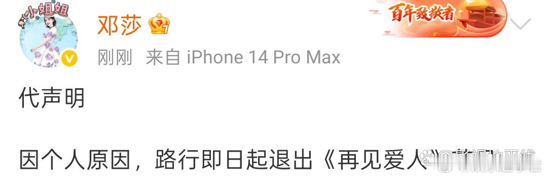 邓莎代发声明,称因个人原因,路行即日起退出《再见爱人》节目。