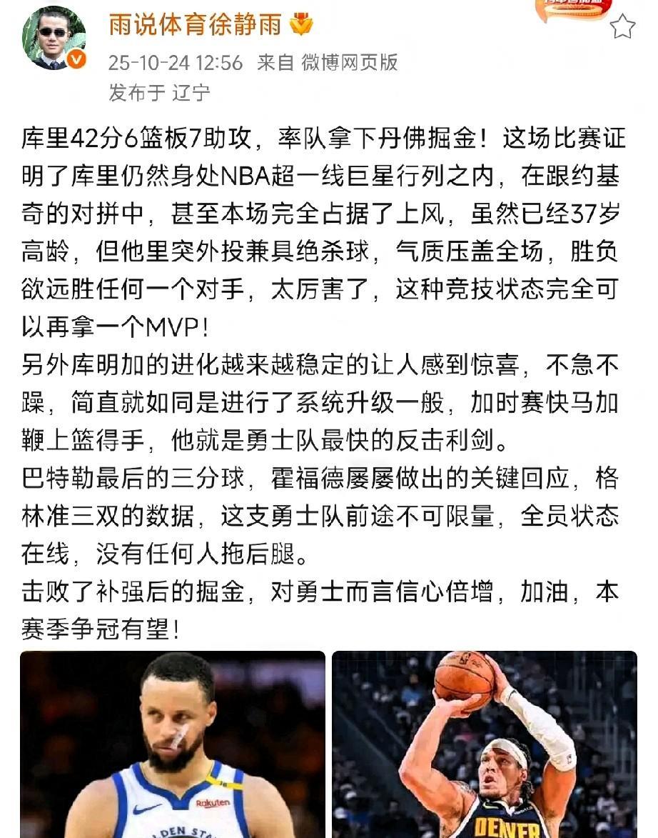篮球资深名嘴苏群:勇士算一个黑马!徐静雨:勇士能拿冠军!恕我直言,库里决胜时刻的担当能力真是詹姆斯望尘莫及的,这并不是哗众取宠,看看库里关键球能力吧,库里和詹姆斯已经不是一个级别的球员,勇士上限永远是库里,对阵完整阵容的掘金,三分绝平进加时后接管比赛,6分险胜对手。掘金逼出勇士最强阵容,但库里打37分钟体能消耗大,建议打开拓者轮休