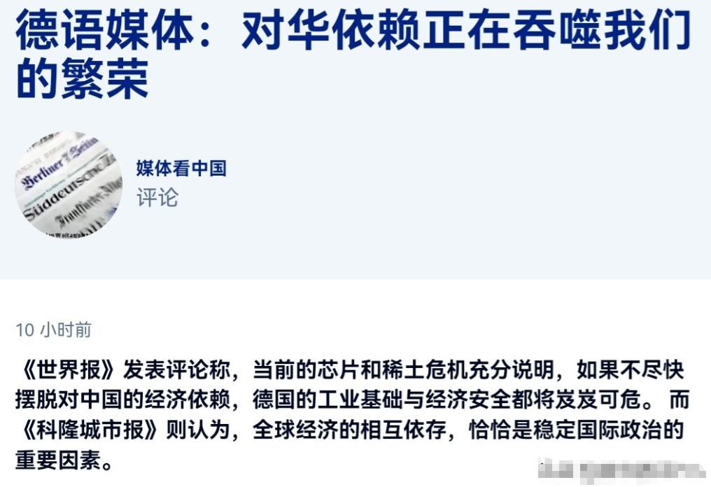 德媒公开对我们表达不满!10月24日,德媒刊文声称,对华依赖正在“吞噬”我们的繁荣!德媒表示,当前的芯片和稀土危机充分说明,如果不尽快摆脱对中国的经济依赖,德国的工业基础与经济安全都将岌岌可危。德国工业对中国原材料的高度依赖已经到了“极其危险”的地步,而北京也正在“毫无顾忌”的将这种依赖关系作为施压的地缘政治武器。 德媒这番抱怨可不是空穴来风,看看德国工业现在的处境就知道,所谓的对华依赖早成了扎在经济命脉上的刺,不拔疼得慌,拔又没力气。就说被吹得神乎其神的德国制造业,表面上看着风光,内里早被原材料依赖捆得结结实实,尤其是稀土这东西,简直成了拿捏德国工业的命门。 全球稀土开采中国占了 69%,到了加工环节更夸张,几乎 100% 的稀土加工产品都来自中国,德国想造电动车、风力涡轮机,少了这东西根本玩不转。 10 月中方刚收紧稀土出口管制,德国企业立马就慌了神,欧洲最大原材料贸易商 Tradium 的总经理都直叹气,以前还能跟中国厂商讲讲价,现在得先求着人家给货,部分稀土产品价格直接涨了 200%,想拿货还得把自家商业信息扒干净交上去换许可证。 更讽刺的是,稀土这东西其实并不稀有,全球近 200 处矿藏不在中国,但德国就是没法自己搞,要么缺基础设施,要么缺技术,等欧洲企业慢悠悠做完季度计划,中国早把二十年的供应链布局完了,现在才想起找替代,早错过了最佳时机。 芯片领域的麻烦更直接,荷兰跟风美国搞安世半导体接管,本想拿捏技术,结果反被中国捏住了命门。安世 70% 的产能都在中国广东,东莞工厂每天 2.5 亿颗芯片销往全球,中国一断供,德国车企先扛不住了。 大众沃尔夫斯堡主工厂直接拉响警报,说 10 到 20 天就得停产,每天损失超 1 亿欧元,宝马、奔驰的新能源产线也跟着停摆,整个德国汽车业的芯片库存撑死也就 20 天。 要知道汽车产业可是德国经济的发动机,每年贡献超 7% 的 GDP,这一停摆不仅 200 亿欧元损失要打水漂,10 万个就业岗位都要悬,说白了就是被中国供应链攥着喉咙,想喘口气都难。 更要命的是这种依赖早就渗透到了民生根本的药品领域,德国 81% 的维生素和 76% 的抗生素原料都来自中国,糖尿病药二甲双胍、止痛药对乙酰氨基酚这些常用药,关键原料几乎全靠中国供应。 德国经济研究所做过压力测试,要是中国供应商停摆,德国每年 4200 万盒药品直接断供,56 种关键药里 20 种都算高风险,而欧洲本地能自给的药物成分才刚过 10%。 现在德国联邦药品研究所的短缺名单上已经有 540 种药了,真要是哪天中方收紧供应,德国人看病拿药都得成问题,这种藏在民生里的依赖,比工业断供更让人头皮发麻。 德媒说中国的损害比美国关税更隐蔽,这话确实没说错。美国搞关税是明刀明枪,中国只需动一动供应链的小开关,德国工业就得抖三抖。 就像稀土管制,打着防扩散的旗号,完全符合国际惯例,可德国工业就是遭了殃;药品原料也一样,不是故意卡脖子,可中国就是占了全球 47% 的抗生素生产基地,欧洲自己跟不上产能,能怪谁呢。 更让人无奈的是中国的战略布局,人家几十年前就砸钱建稀土实验室,高校开专门课程,攒下全球最多的采矿专利,现在掌控 85% 以上的精炼产能、99% 的电池级石墨,都是一步步铺出来的局。 欧洲企业以前总嘲笑中国企业格局小,现在才发现自己只顾着算季度利润,人家早把二十年的棋下完了。 德国原材料署也承认,就算想建自主供应链,要么缺钱要么缺技术,连中国企业都喊赚钱难,欧洲的新项目更没法推进。 这种温水煮青蛙式的依赖,比突然的贸易战更可怕,等反应过来的时候,工业、民生、经济早被缠得动弹不得,也难怪德媒急着喊要摆脱依赖,毕竟再这么下去,真要被 “吞噬” 了繁荣。