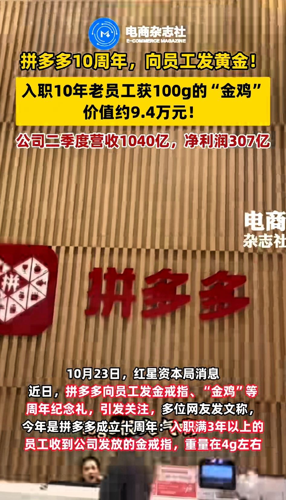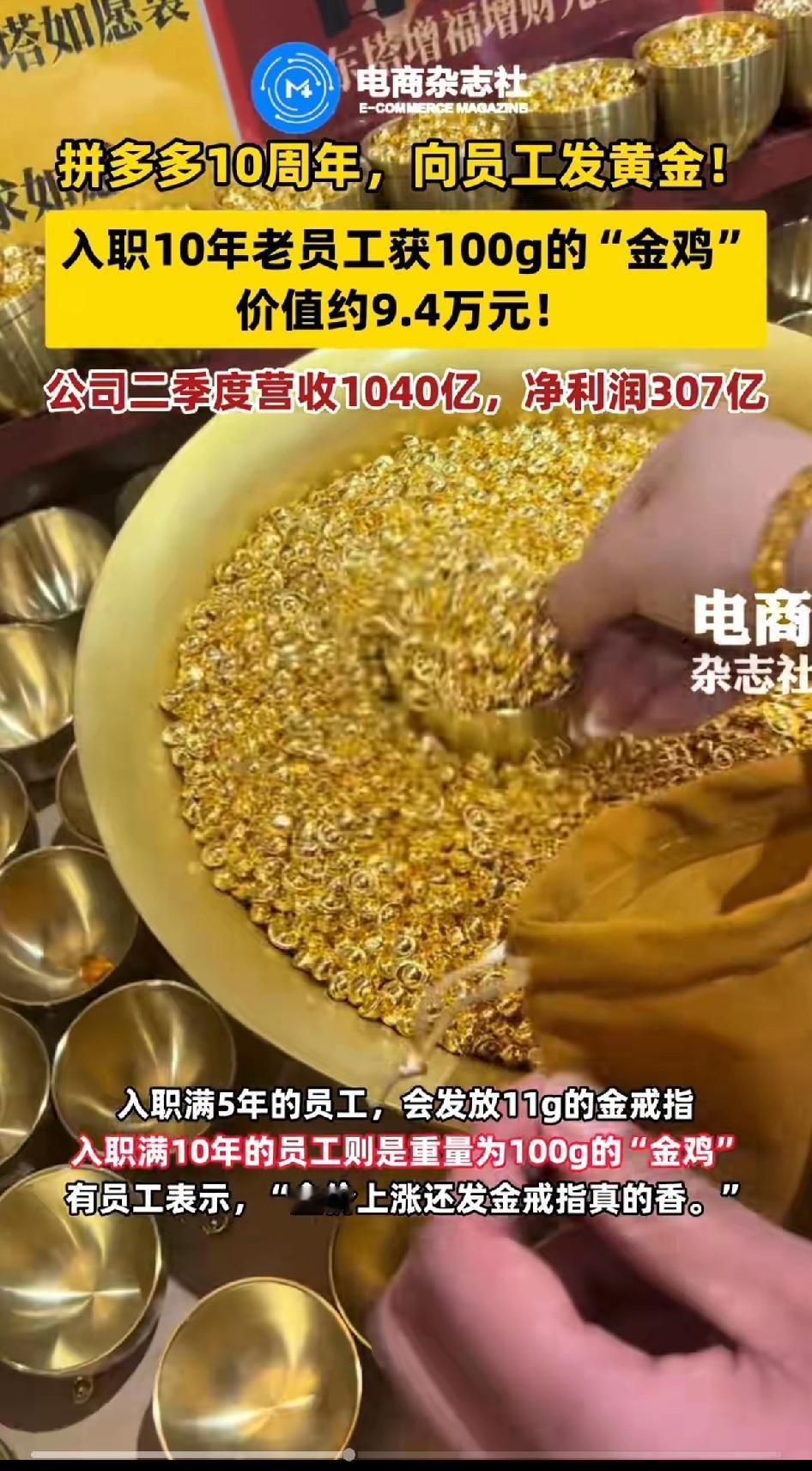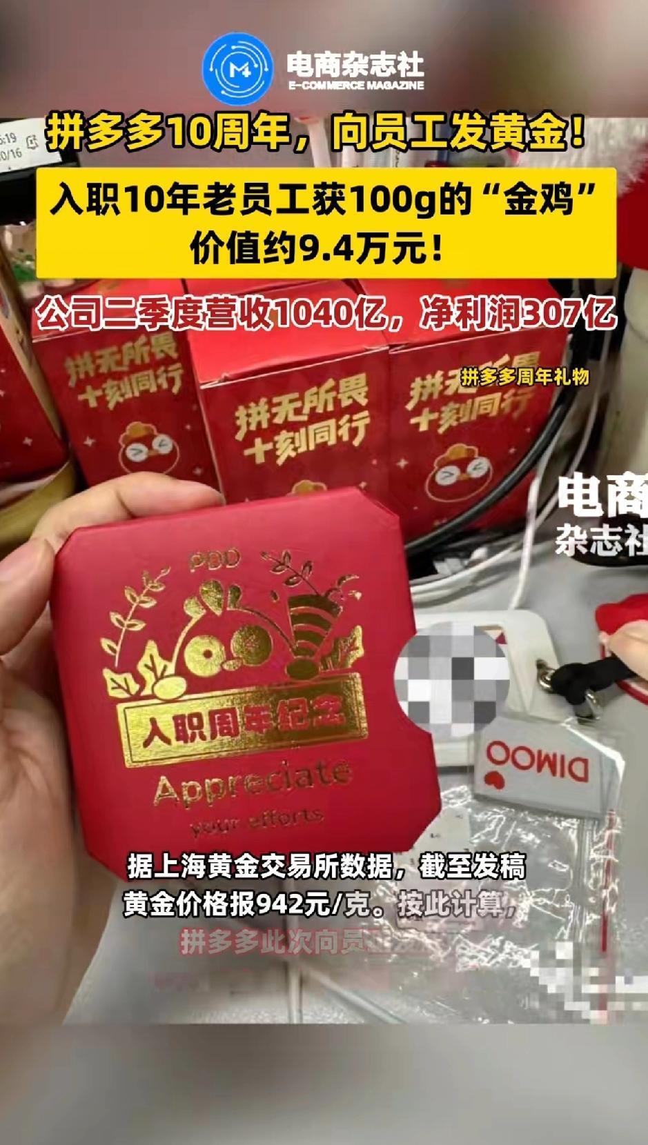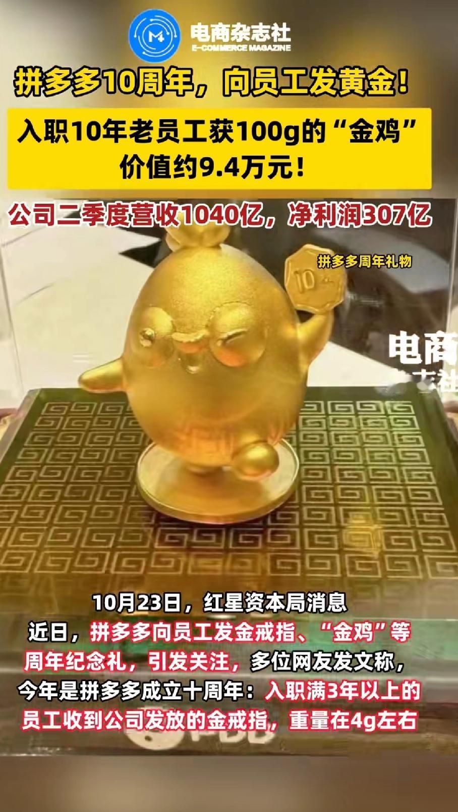拼多多10周年,向员工发黄金! 入职10年的老员工获100克得“金鸡”入职满3年以上的员工能收到约4克的金戒指,满5年的是11克的金戒指,而入职满10年的老员工直接获100克的“金鸡”。 按当前金价,这100克“金鸡”价值约9.4万元。 拼多多平时很低调,给员工发放福利时却出手大方。尤其是黄金大涨是更是提高克数,老板确实大气! 给员工发现金员工也不舍得买金鸡,企业用黄金来作为福利发放,一是能保值,二是让员工更加尽心尽责的为公司效力。可谓是一举多得! 其实从2024年起,拼多多就有送员工黄金的传统,去年入职满10年员工收到的是60克金鸡,今年直接升级到100克。 金价大涨后拼多多还能保证员工的福利发放,看来该企业的诚信确实值得学习。就如售后一样诚信稳妥! 不得不说,这福利太让人眼红了,也太会留住人才了!