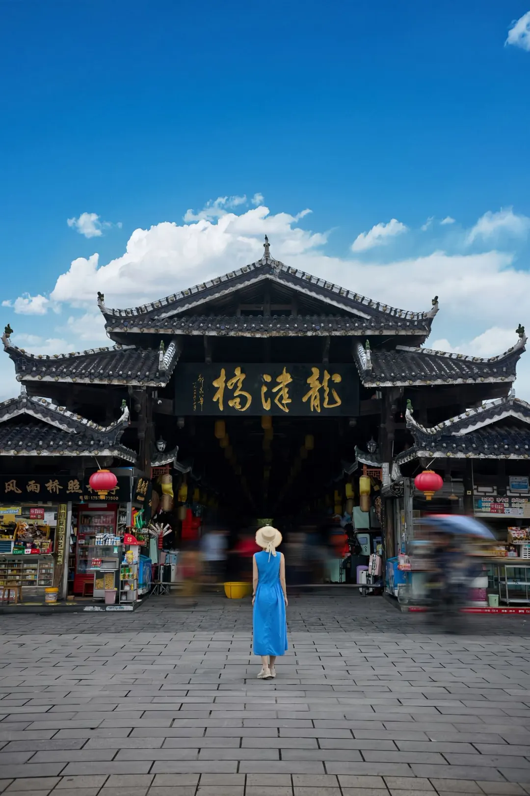龙津风雨桥是一座活着的“桥上市集”,夜幕降临时整座桥亮起暖黄的灯,美得像《千与千寻》的幻境!