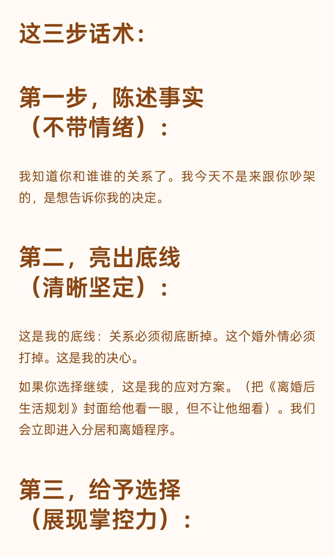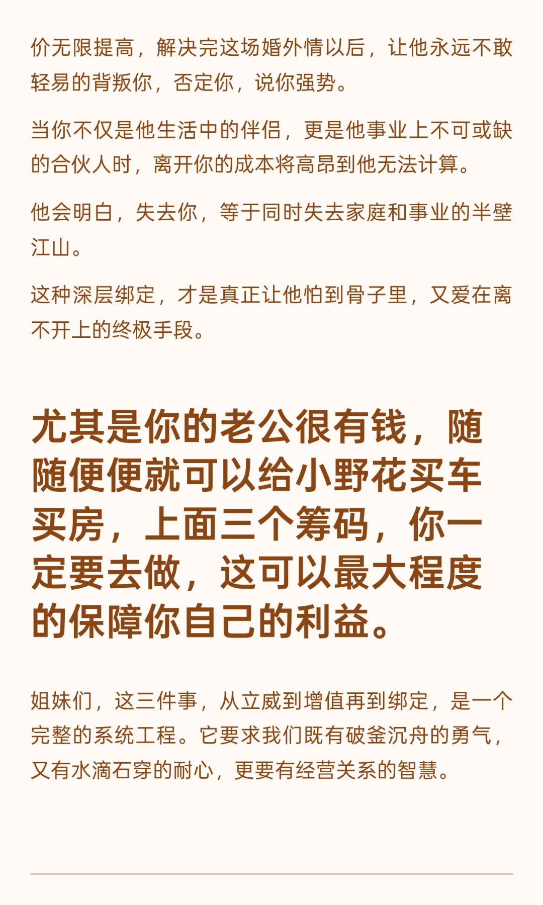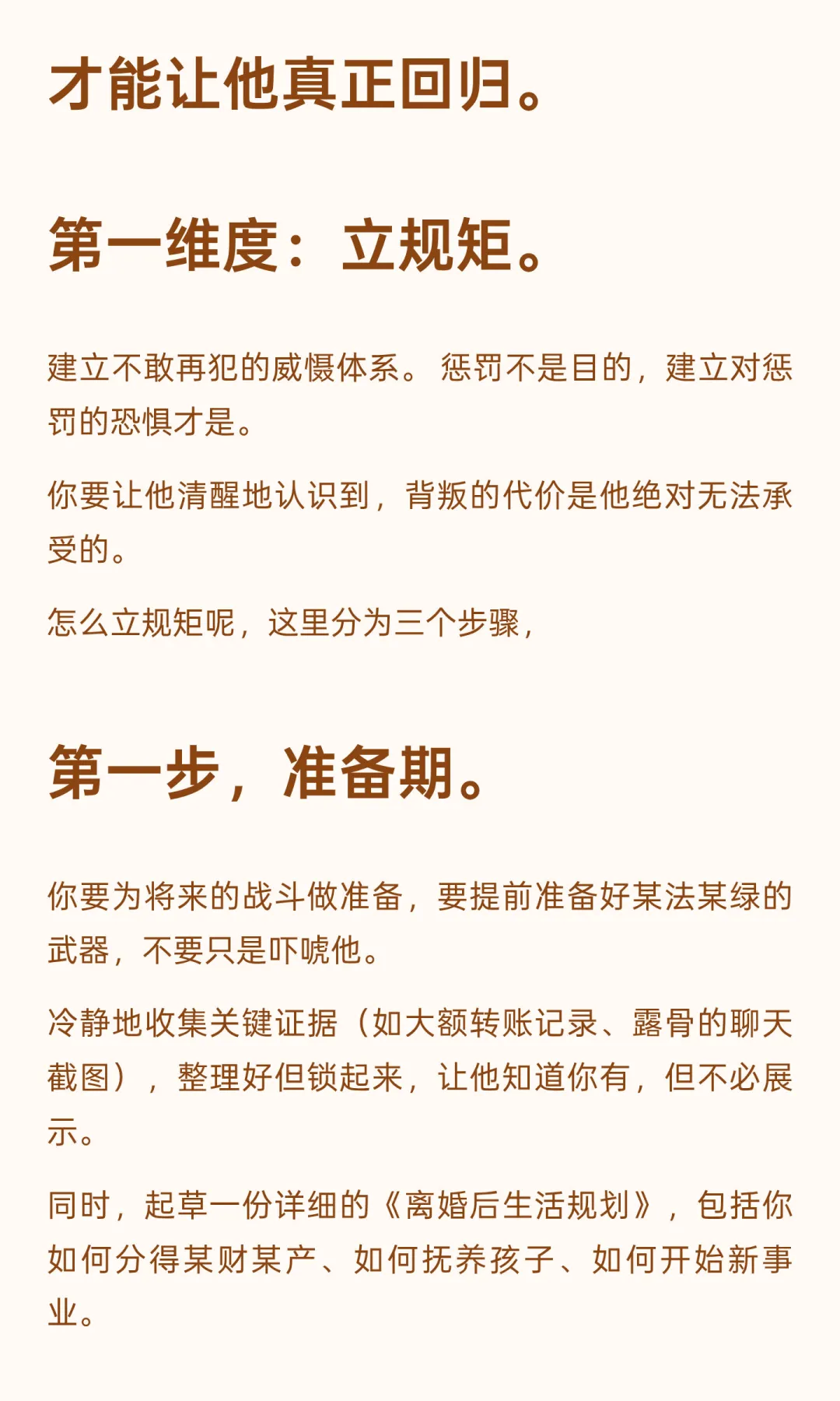 面对老公出轨,通过立规矩、提升自己和打造命运共同体,让他既怕失去你,又爱依赖你。立规矩让他明白背叛的代价,提升自己增强价值感,绑定经济、人脉和事业,确保他不敢背叛。