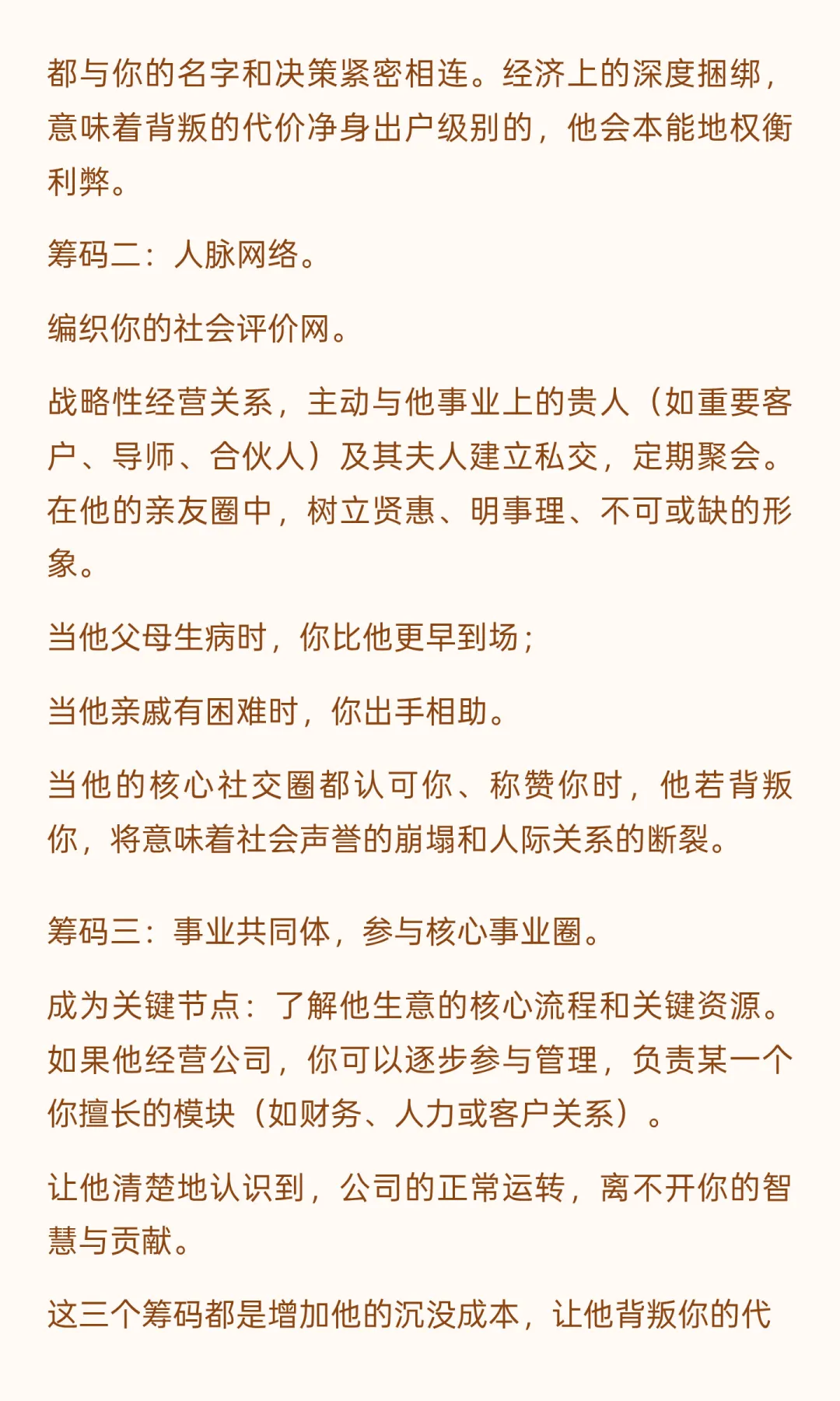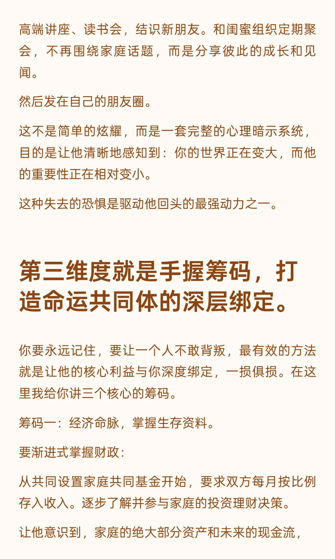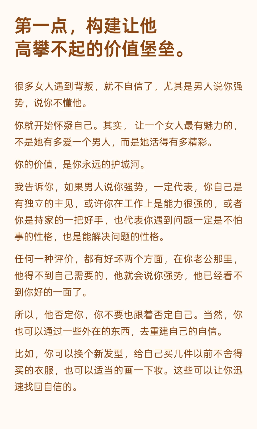 面对老公出轨,通过立规矩、提升自己和打造命运共同体,让他既怕失去你,又爱依赖你。立规矩让他明白背叛的代价,提升自己增强价值感,绑定经济、人脉和事业,确保他不敢背叛。