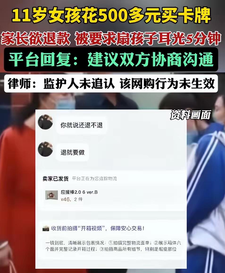 11岁女孩在潮玩平台花费500多元购买卡牌,在家长申请退款时,竟遭遇卖家提出“上传5分钟打耳光视频”的要求。无奈之下,家长只能向平台客服求助,客服却表示“无法强制,建议协商”。未成年在家长不知情的情况下消费,到底能不能退还? 有网友表示:这个家长也很奇怪,你把东西给人家退回去,为什么申请仅退款呢?作为卖家怎么鉴定白嫖?卖家就该吃亏吗? 孩子确实应该得到教训,这位家长没意识到孩子犯了多大错么?要是我,我就照做,告诉孩子,成年人的世界犯不起错,每走一步都要谨言慎行,今天的事情只是做一个示范,你以后每次做决定,都要想一想今天!事儿教人,一次就会! 如果是家长透露的密码。那就是家庭问题。毕竟人家无法识别是不是未成年。但退货没拆封的应该支持退货。拆封的自认倒霉。 未成年人不懂事可以原谅,我就想问家长,一个未成年人他怎么付的款,既然你给孩子了付款的权限,那就是认可他自主消费权,那还退什么款。 对此大家怎么看呢