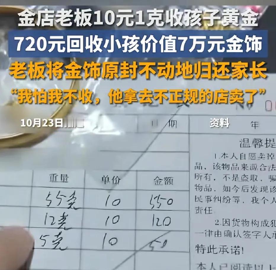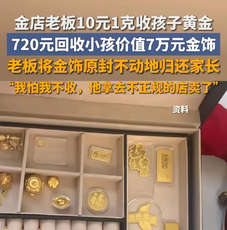 四川雅安,男子开了一家金店,一小孩带着金首饰来卖,男子赶紧以10元1克的价格卖给了小孩,收下了总重72克,含55克金手镯、12克金项链、5克金戒指的首饰,共支付720元给小孩。不料,男子转眼就把视频曝光到网上,让孩子家长联系他,把金子归还,这一举动让网友纷纷点赞。 据悉,男子开了一家金店首饰多年,经常遇到形形色色的顾客。 让他没想到的是,当天遇到一个小男孩来店里。 男子正纳闷着,本以为他来看首饰,谁知小男孩一句话就让男子吓了一跳。 他开店这么久,第一次遇到这样的情况。 孩子进店后,略显局促地说明来意,想把这些金饰卖掉。 男子心中顿时起了疑虑,他一边仔细打量这些首饰,一只沉甸甸的金手镯、一条精致的金项链和一枚小巧的金戒指。 看起来都是家庭日常佩戴的贵重物品,绝非一个孩子能自主处理财产。 他在与孩子的交谈中,进一步确认了猜想,这些金饰果然是孩子从家里偷偷拿出来的,至于具体原因,孩子却支支吾吾说不清楚。 男子心想,这小孩年纪那么小,父母又不知道,如果我不收,他一定会去别的店,甚至找一些不正规的渠道卖掉首饰。 那后果要是让他家长知道了,那得多着急。 小孩完全不懂男子的心理,他有些拘谨地看着男子,心里只想着这些首饰能卖多少钱。 男子赶紧拿出秤称重,结果更是让他心头一震,手镯55克、项链12克、戒指5克,总共足足72克! 为了稳住这些贵重物品,同时避免孩子再去别处冒险,男子灵机一动,决定先收下这些金饰。 他以每克10元的象征性价格,给了孩子720元,还特意写下收据,详细注明了物品信息和交易金额,反复叮嘱孩子妥善保管好钱和收据。 完成交易后,男子立刻将事情的经过和金饰的照片、视频发布到网上,诚恳地呼吁孩子的家长看到信息后尽快与自己联系,前来取回金饰。 他在视频中表示:这些首饰对家庭来说意义非凡,孩子不懂事,我不能让家长的心血白白损失。钱我已经给了孩子,等家长来取货时,把720元给我,我退回金首饰。 最终,孩子家长联系上了金店男子,金店男子原封不动退还了金首饰。 那么,从法律角度看,该如何看待此事呢? 《民法典》第19条规定:八周岁以上的未成年人为限制民事行为能力人,实施民事法律行为由其法定代理人代理或者经其法定代理人同意、追认;但是,可以独立实施纯获利益的民事法律行为或者与其年龄、智力相适应的民事法律行为。 小男孩处置72克金饰的行为,明显超出了其年龄和智力认知范围,且未经法定代理人同意或追认,所以该买卖合同自始无效。 家长有权主张合同无效,要求金店返还金饰,同时需退还金店支付的720元价款。 《民法典》第157条规定:民事法律行为无效后,行为人因该行为取得的财产,应当予以返还;不能返还或者没有必要返还的,应当折价补偿。 买卖合同自始无效,金店老板取得的金饰和家长需退还的720元价款,均属于应相互返还的财产。 老板主动返还金饰的行为,完全符合该条规定的法律后果,是对无效合同财产处理规则的自觉遵守。 要是金店老板按正常价格收了,很可能会让孩子和他爸妈的财产受损失。而老板特意用低价先把金子收下来,就是怕孩子去别的不正规店铺随便把金子卖了,这其实是在一定程度上保护了孩子家的财产。 《消费者权益保护法》第4条规定:经营者与消费者交易应遵循公平、诚实信用原则。 作为专业金店经营者,老板负有审查交易方身份和物品来源的审慎义务。 他发现孩子出售贵重金饰存在异常后,未放任风险扩大,反而通过低价收购稳住财物并主动联系家长,既履行了经营者的基本注意义务,也践行了诚实信用原则,避免了因过错收购未成年人擅自处分的财产而承担更多法律责任。 反之,若金店明知未成年人无权处分仍正常价格收购,会因存在过错需承担相应赔偿责任。 对于此事,你怎么看?