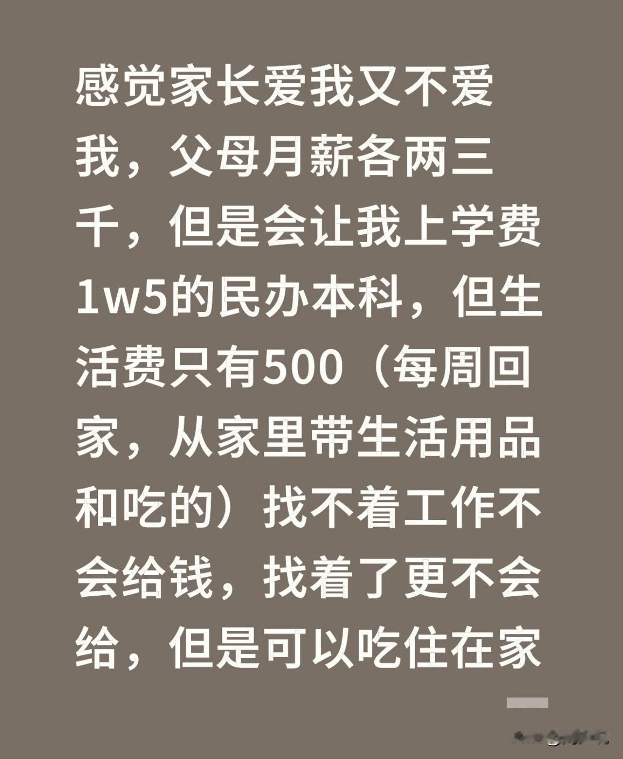 遇到这样的孩子怎么破?一位女大学生发文吐槽:感觉家长爱我又不爱我,父母月薪各三千,让自己读1.5万的民办本科,但每个月生活费只有500元,每周回家带生活用品和吃的,找不着工作不会给钱,着了更不会给…… 看完这位女大学生的话,周少不禁感叹。其实这事没有绝对的对错,却藏着普通家庭的无奈与隔阂。父母愿意承担高额学费,是想给孩子更好的教育机会,这份心意难能可贵; 但忽略了500元生活费难以支撑大学生活,也少了对孩子的细致关怀。沟通才是破局关键,女生可以和父母坦诚聊聊开支困境,父母或许也该说说家庭经济压力,互相理解才能化解这份“爱与不爱”的困惑。 如果是你,你会如何解决这个问题呢?#寻美三湘# #长沙新朋友#