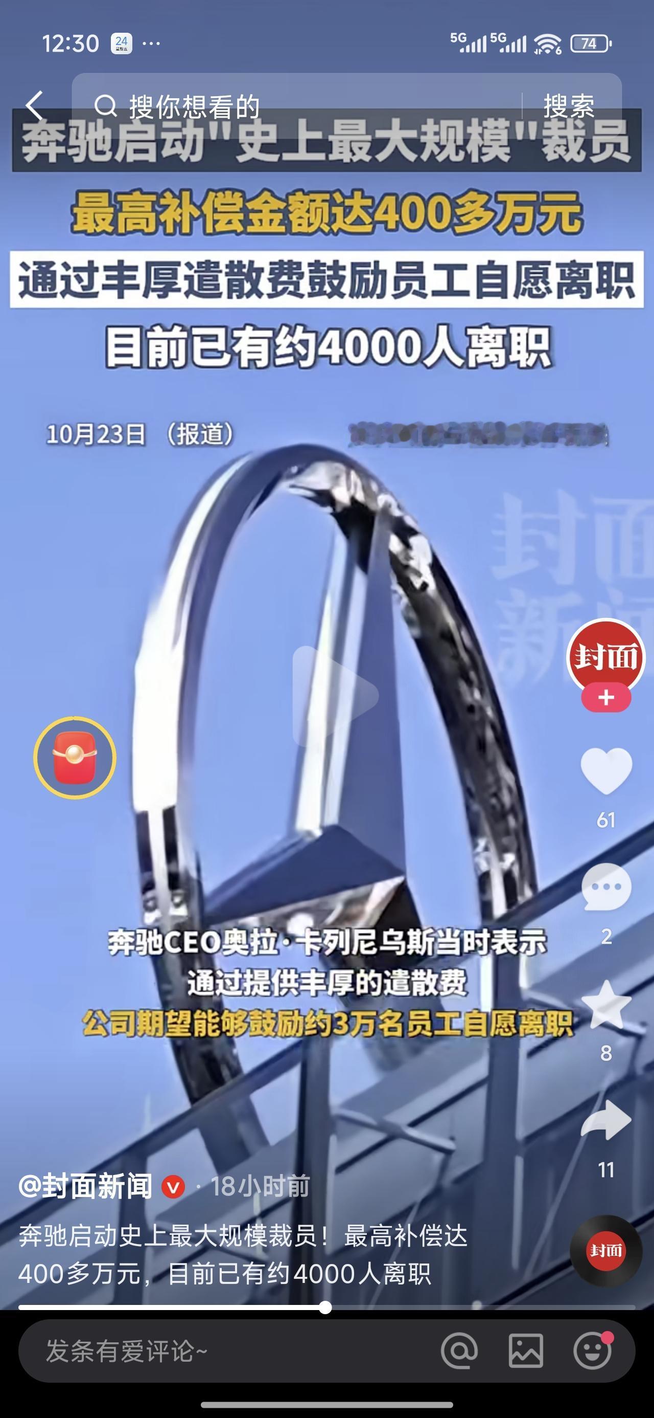 有媒体报道,奔驰裁员按N+11进行补偿,每当看到这种消息的时候,我们的反应就是羡慕、嫉妒、恨。裁员的时候很能看出一家企业的担当。真希望我们的标杆企业都学校一下,不要对自己有利的就按高标准,对自己不利的就往最低标准靠。