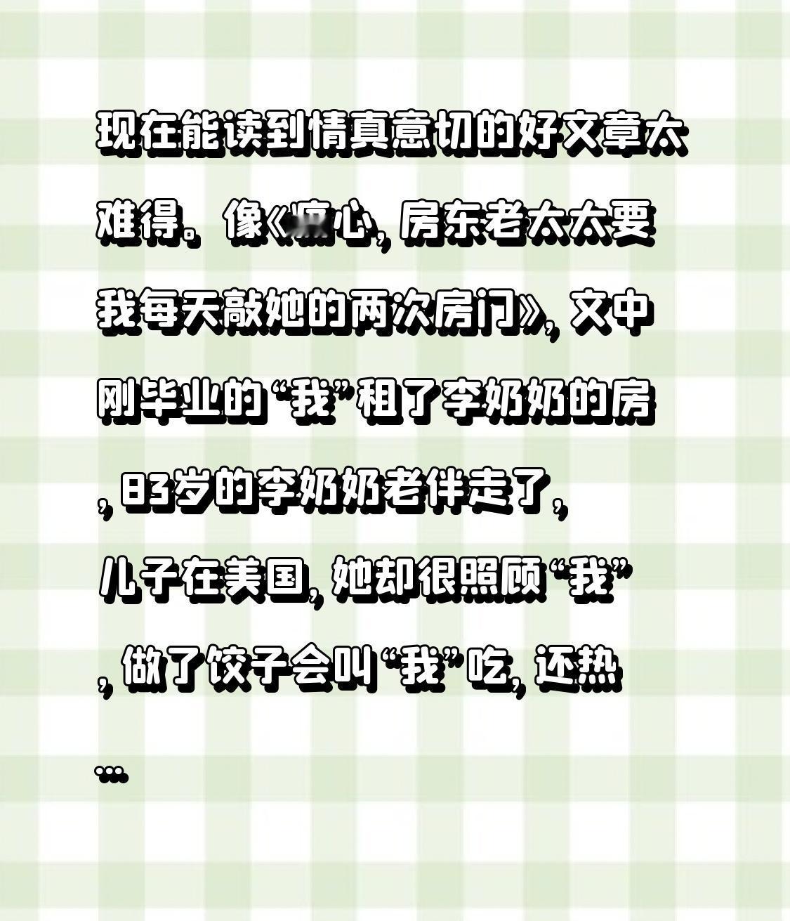 现在能读到情真意切的好文章太难得。像《痛心,房东老太太要我每天敲她的两次房门》,文中刚毕业的“我”租了李奶奶的房,83岁的李奶奶老伴走了,儿子在美国,她却很照顾“我”,做了饺子会叫“我”吃,还热情打招呼。这让“我”想起自己的奶奶,陌生的两人在特殊环境里有了温暖的情谊。 古代也有不少真情书信,李斯劝秦始皇别赶走外国人,诸葛亮教育儿子学习,都直白感人。在这快餐文化时代,能有这些触动人心的文字,真是一种幸运。