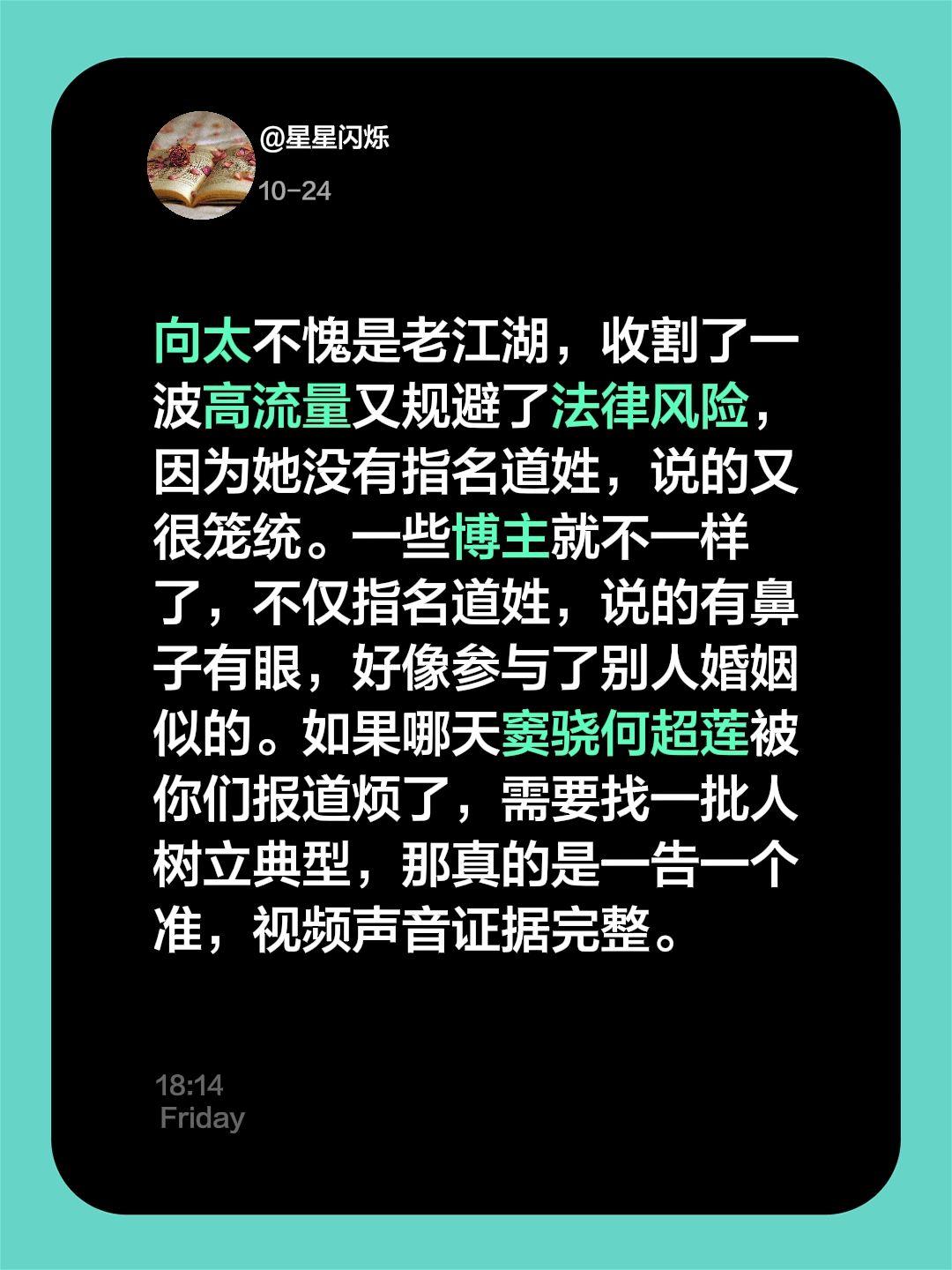 多向“向太”学习,我评论了@好运小刘 的作品: 向太不愧是老江湖,收割了一波高流量又规避了法律风险,因为她没有指名道姓,说的又很笼统。一些博主就不一样了,不仅指名道姓,说的有鼻子有眼,好像参与了别人婚姻似的。如果哪天窦骁何超莲被你们报道烦了,需要找一批人树立典型,那真的是一告一个准,视频声音证据完整。窦骁 何超莲向太