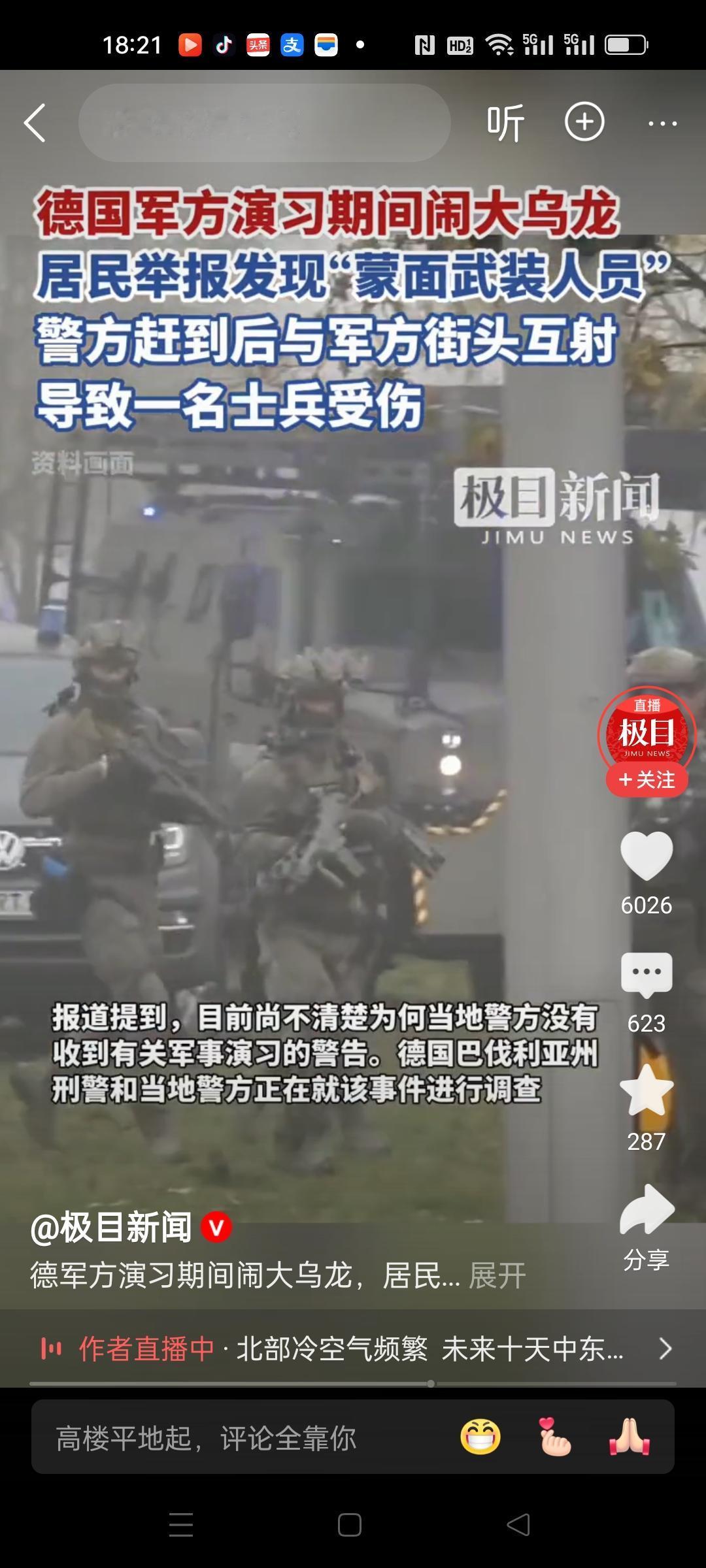 德国军方演习,竟然没有发通告啊!附近居民都不知道,一看到拿枪的在街上晃,马上报警说有持枪蒙面武装人员。 奇怪是警察也没收到报备,马上出警看到就打。 军方可能以为对方是演习的,留了一手,警方却以为对方是恐怖分子,下狠手,结果打伤一名士兵。 这场乌龙事件搞得好,希望以后多搞[呲牙]