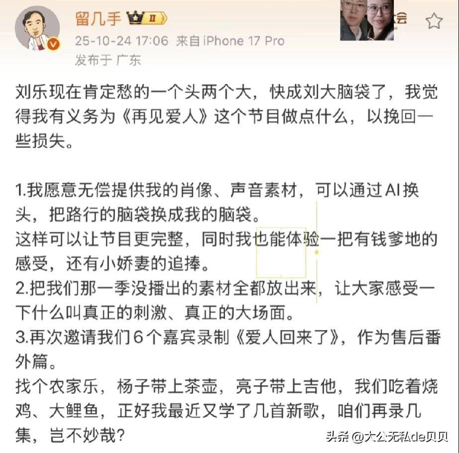 留几手对于路行是真爱啊! 竟然隔空喊话再见爱人节目组,把路行的脸换成他的,还说是「无偿提供」。 一来能保证节目的完整性,二来可以让他体验一把被小娇妻们追捧的感觉。 哈哈,不得不说,他这个idea还是蛮不错的(≧∇≦*) 我也挺想看看,手哥的脸+路行的内涵,观众是不是同样买账呢? 现在这样剪辑,确实看着很别扭,尤其邓莎这条线,都看不到完整版了,还是挺遗憾的。 毕竟这一季热度最高的,就是他们这对夫妻了。