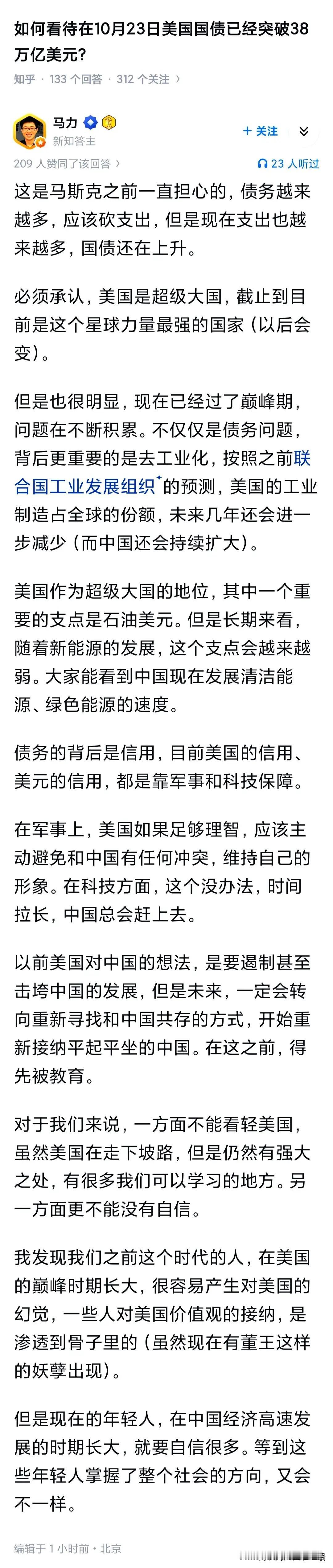自从马斯克去职了效率部长后,老美的砍支出行动,不仅没有减少,支出反而增多,这就无解了。这意味老美已经到了转折点,那就是吃老美财政的人太多,越砍支出,反而越砍越多。 老美没钱,就只能借国债来支出财政,结果就是美债都欠债到了38万亿美元。而且这不是终点,几乎不到三个月,美债就多一万亿美元的水平,真的是债多了不愁? 在历史上因为财政崩溃的王朝很多,就像大明末期,也是财政和赋税收不上来。因为士绅不交税也不纳粮,占了太多的土地,导致大明越来越穷。 老美也是这样,富豪交税越来越少,普通人交税越来越多,所以老美跟大明末期是很像的。川普这样的大富豪,几乎不交什么税款的,而且被觉得很正常。 所以美债只能越来越多,大家都不去处理美债,那就只能滚雪球的越来越大。老美都成了我死后哪管洪水滔天? 38万亿美元不是终点,越借越多,那咱们只能不停的抛弃美债,抛光了也就没事了,任由老美自己去折腾吧!