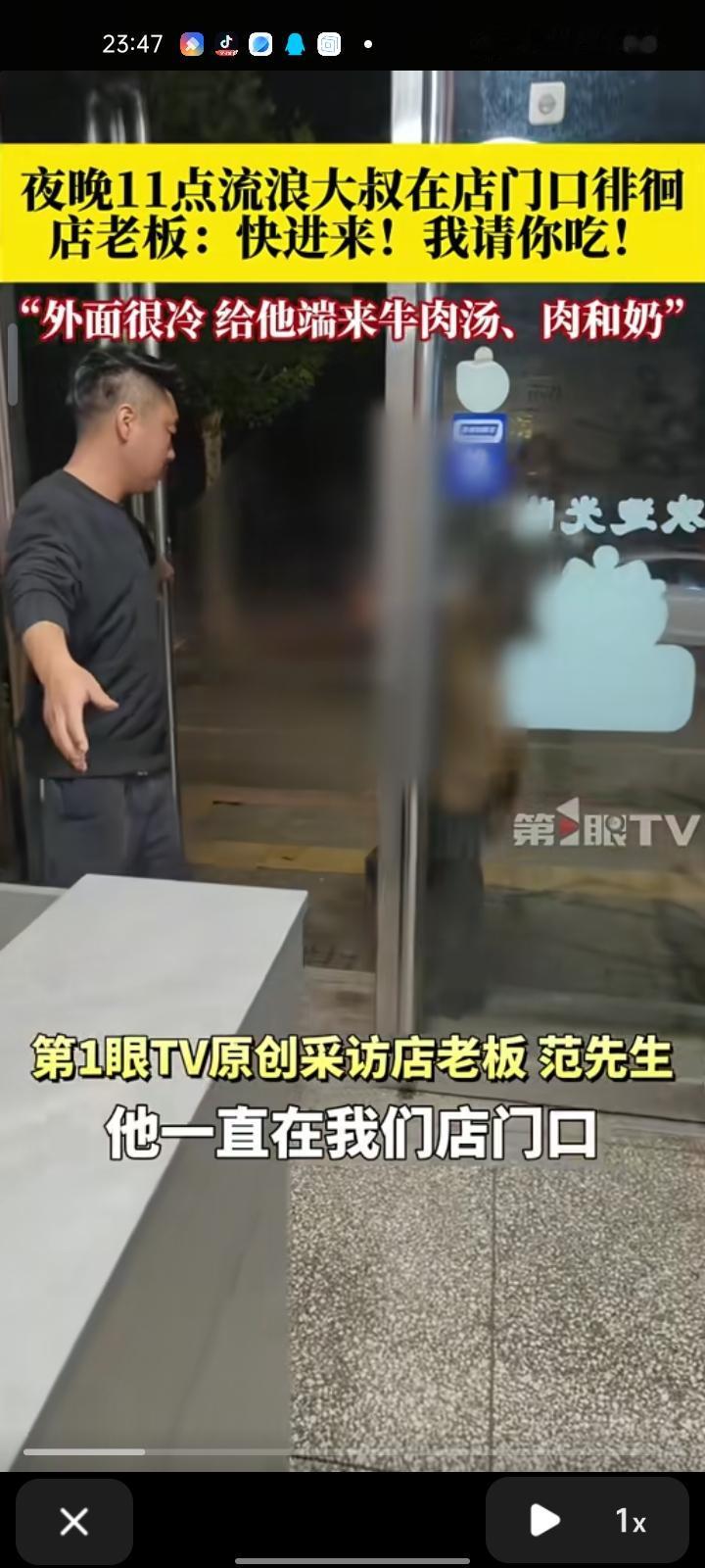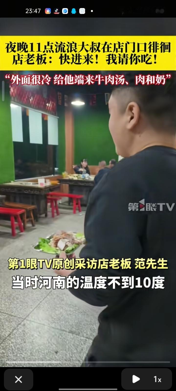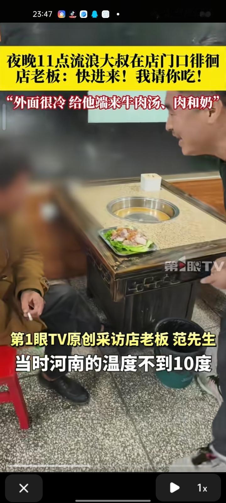 10月22日,洛阳市汝阳县。晚上11点有位流浪大叔在店门口徘徊,店老板见状后说:快进来,我请你吃,当天河南的温度不到十度,特别冷。店老板讲述,这位流浪大叔腿脚不便,右手残疾,平时一个人生活,衣服是左邻右舍送给他的。邀请大叔进来后,给他端来牛肉汤、肉和奶。店老板看着流浪大叔,心里很不是滋味,善意就是在力所能及的范围内帮助别人