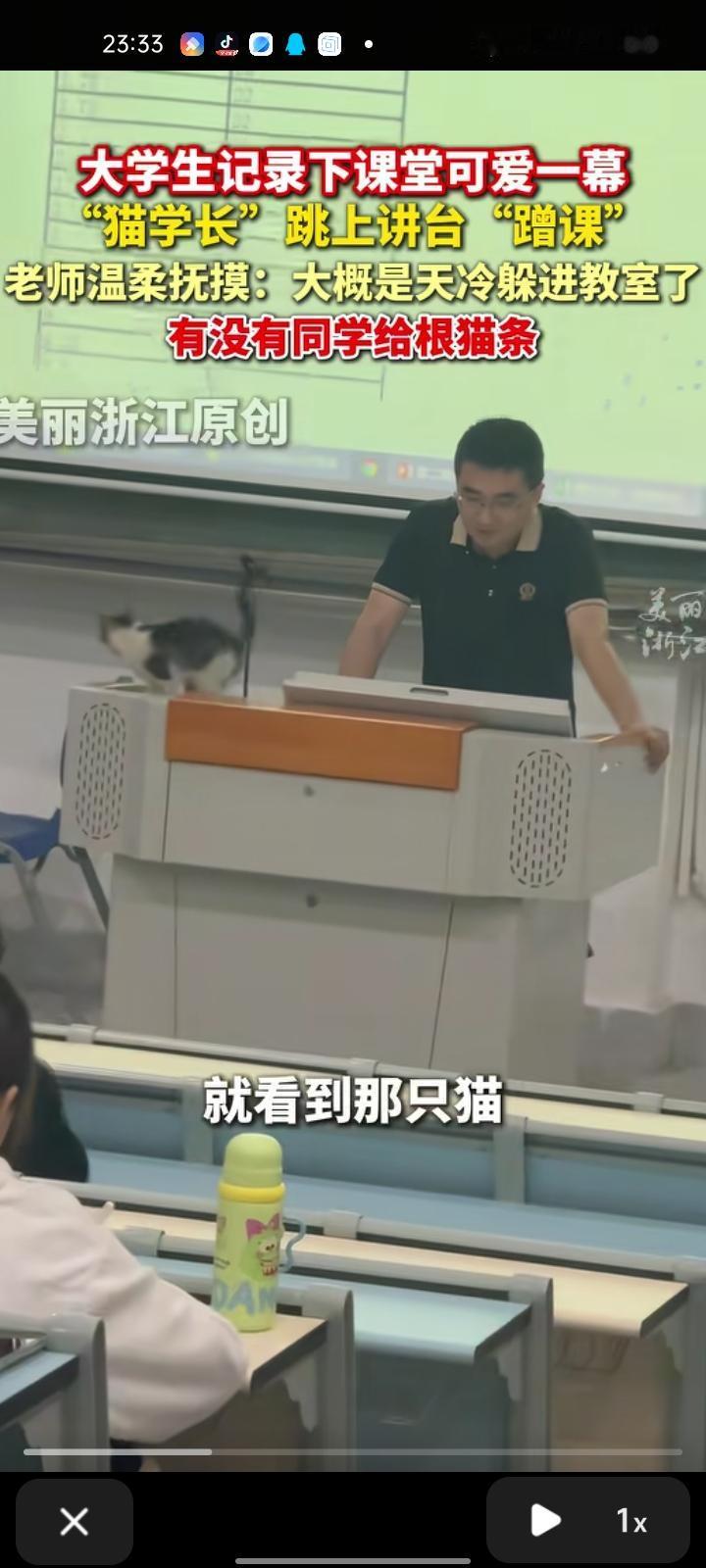 10月22日,福建福州。大学生记录下课堂可爱的一幕,“猫学长”跳上讲台“蹭课”,老师温柔抚摸。他表示,这只猫大概是天冷躲进教室了,老师平时喜欢小动物,对同学也非常友善,老师对学生们说“有没有同学给根猫条”。