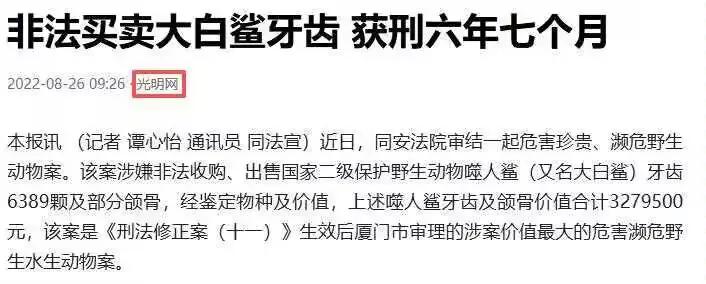 这玩意儿比黄金还贵!福建男子孙某某靠着一桩牙齿生意闷声发财七年,最终在6389颗鲨鱼牙上栽了跟头。2021年,他因非法买卖噬人鲨(大白鲨)牙齿被判刑6年7个月,罚金15万。这些牙齿看似是文玩圈的硬通货,实则是国家二级保护动物的生命代价。 噬人鲨全球仅剩几千只,它们的牙齿成了黑市抢手货。孙某某从海外低价收购,加工后挂上电商平台,连鉴定报告都拦不住他继续售卖。更讽刺的是,噬人鲨虽是海洋顶级猎手,却因繁殖慢,栖息地破坏和人类捕杀濒临灭绝。每颗牙齿背后,都是一场生态悲剧。 此案不仅是打击犯罪,更暴露了文玩收藏的法律盲区。网友热议有人觉得卖牙齿不算杀生,但没了买卖才有保护!如今,多地开展野生动物保护宣传,鼓励举报非法交易。正如法官所言,噬人鲨是海洋伞护种,保护它们就是守护整个生态系统。 文玩爱好不能逾越法律红线。孙某某的案例警示我们,所谓小众收藏可能踩中生态雷区。保护濒危物种,从拒绝一件鲨鱼牙工艺品开始。