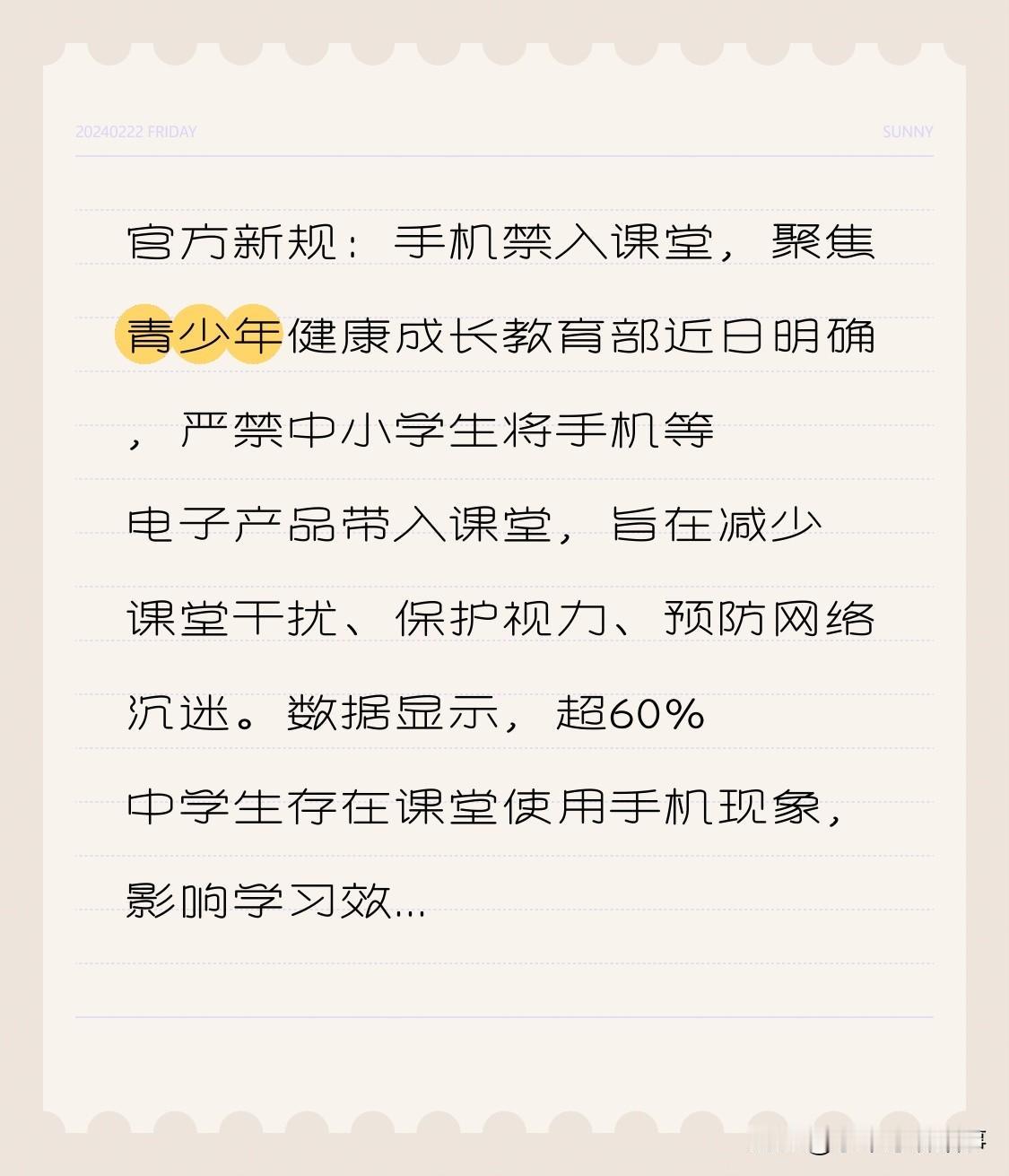 震惊!官方出台新规:禁止手机进入课堂,聚焦青少年健康成长 教育部近日明确规定,严禁中小学生将手机等电子产品带入课堂,意在减少课堂干扰、保护视力、预防网络沉迷。数据显示,超六成中学生课堂使用手机,影响学习效率。专家称,青少年大脑发育不全、自控力弱,手机易分散注意力。新规引家长热议,多数支持并呼吁家校共营造良好学习氛围。(来源:教育部官网)