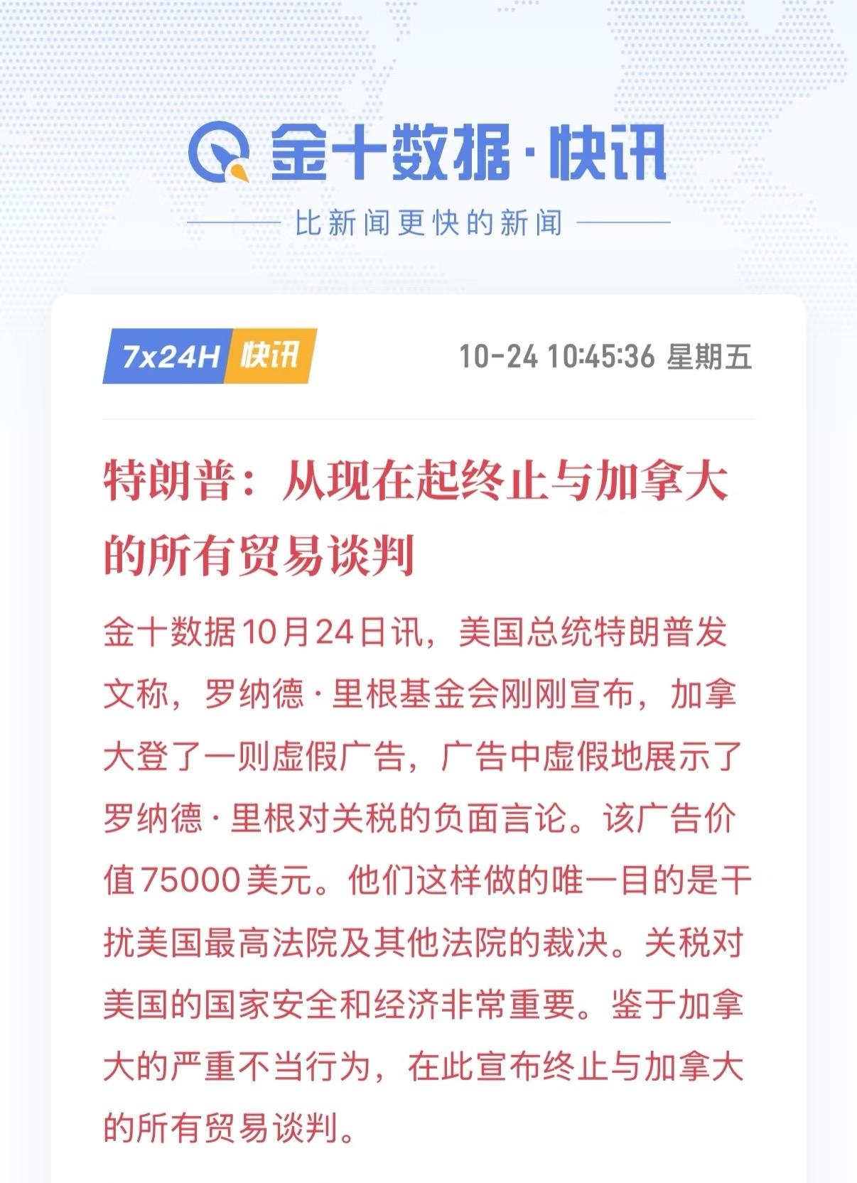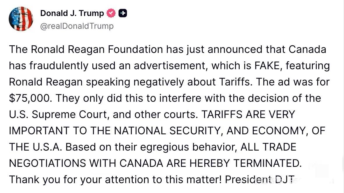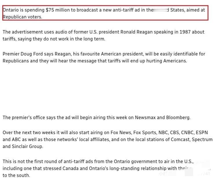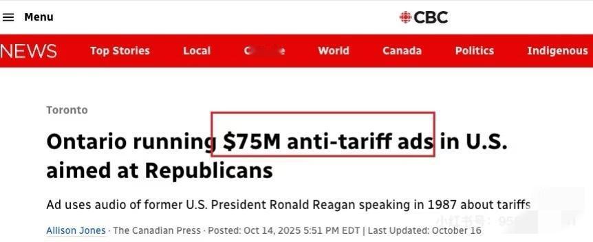 美国终止与加拿大谈判。 DJT说,加拿大花费75000美金登了黑他tariff policy的负面广告。因此,他决定终止与加拿大的所有谈判。 但CBC报道却说是7500万美金。 DJT是不是太激动笔误了…