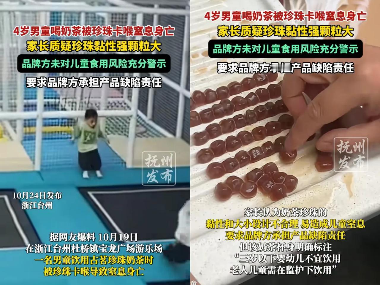 可怜的孩子, 死了还被父母当筹码! 近日,浙江台州发生了一起悲剧,一位妈妈带4岁儿子去一广场的游乐场玩,玩到一半,妈妈给孩子买了一杯古茗珍珠奶茶。 就是这杯珍珠奶茶,让孩子丢了命,因为孩子是在边玩淘气堡的蹦床边喝奶茶的,边跳边喝奶茶,珍珠堵塞喉咙从而窒息死亡了,这谁能预料?! 现在家长倒好,不去反思自己的问题,反倒咬着奶茶店不放,说珍珠太黏、颗粒太大。可奶茶小程序早标了“老人儿童需监护下饮用”。 3岁以下都不让喝,商家能做的提示都做了。游乐场也说了,是家长偷偷带的饮料,工作人员都没拦住。 真不是冷血,这事儿根儿上就是家长监护失职!4岁孩子的吞咽功能本就没发育好,珍珠这种小料本就该格外当心,还让他边剧烈运动边吃,这不是把娃往危险里推吗? 有数据说,90%家长听过海姆立克急救法,真会用的连两成都不到,这才是最该反思的。 别一出事就想着找替罪羊,商家不该当这个“冤大头”。监护权从来不是摆设,而是实打实的责任。你觉得这事儿里,除了家长,游乐场和奶茶店该担多少责?