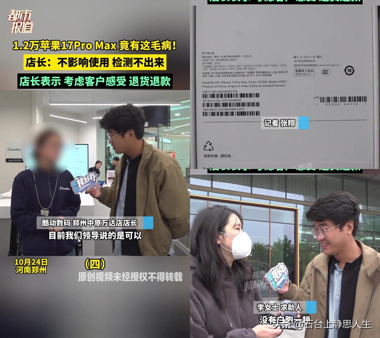花1.2万买的苹果17Pro Max刚拆封,耳朵凑近就听见“滋滋”电流声!找酷动数码店长要说法,对方直接甩两句话:“正常,硬件检测不出来”,换你是消费者,能忍? 一开始店长咬死“不影响使用,不算质量问题”,结果记者一来,立马同意退货。 有人说换成某菊某米,早被骂品控差了吧? 还有人问直接走14天无理由不就完了?可要是商家以检测没问题拒退,普通人哪有精力掰扯? 更有人说“没有记者能这么痛快给退?”这才点中痛点,碰到检测不出来但自己难受的问题,得靠媒体给底气! 咱普通人花一万多买新手机,图的不就是拆封时的完美感吗? 在意的不是那点电流声,而是我花了钱,却被说没事找事的委屈! 大家遇到过检测不出来但自己用着难受的商品吗?会像这消费者一样找媒体吗?