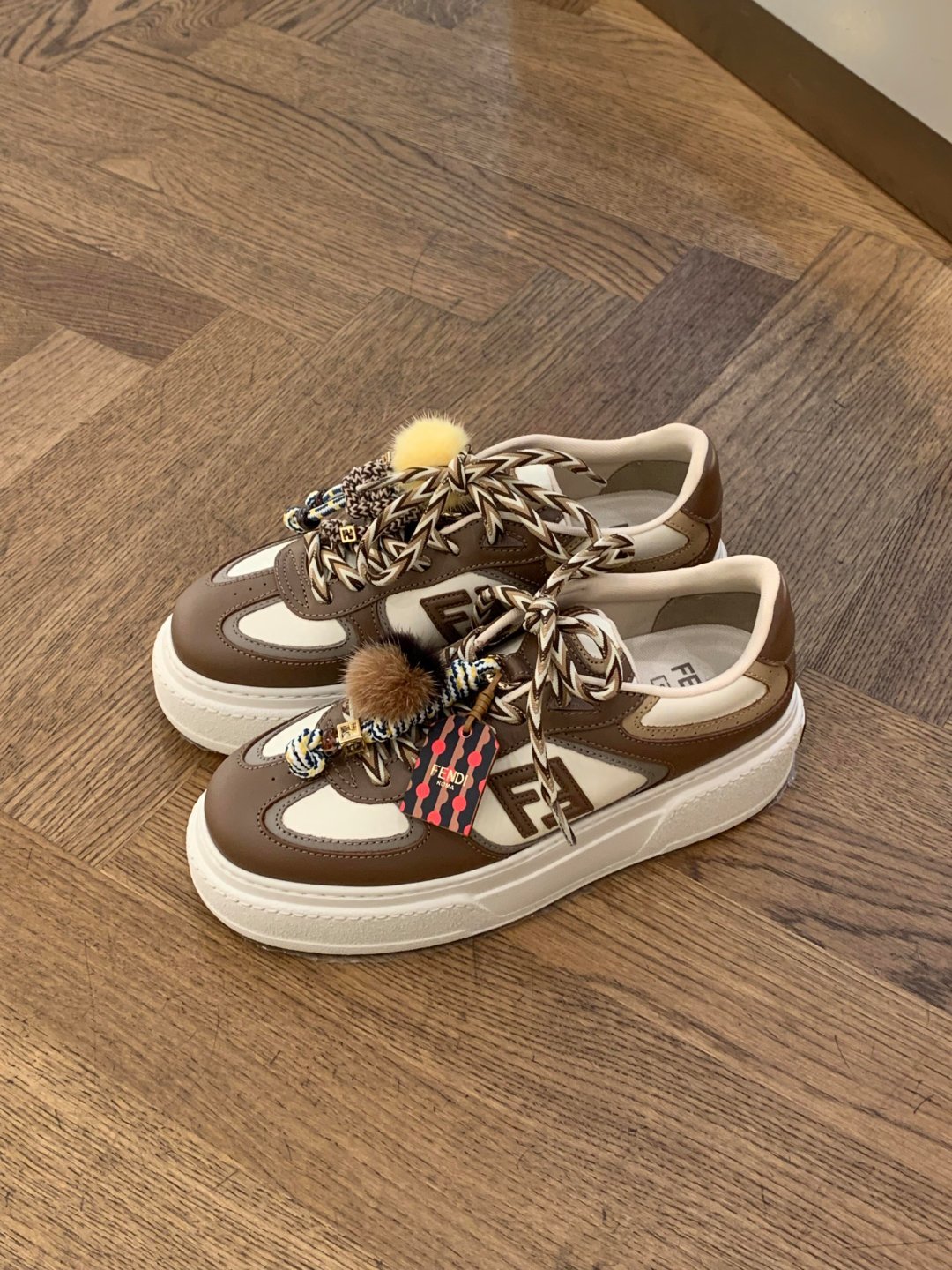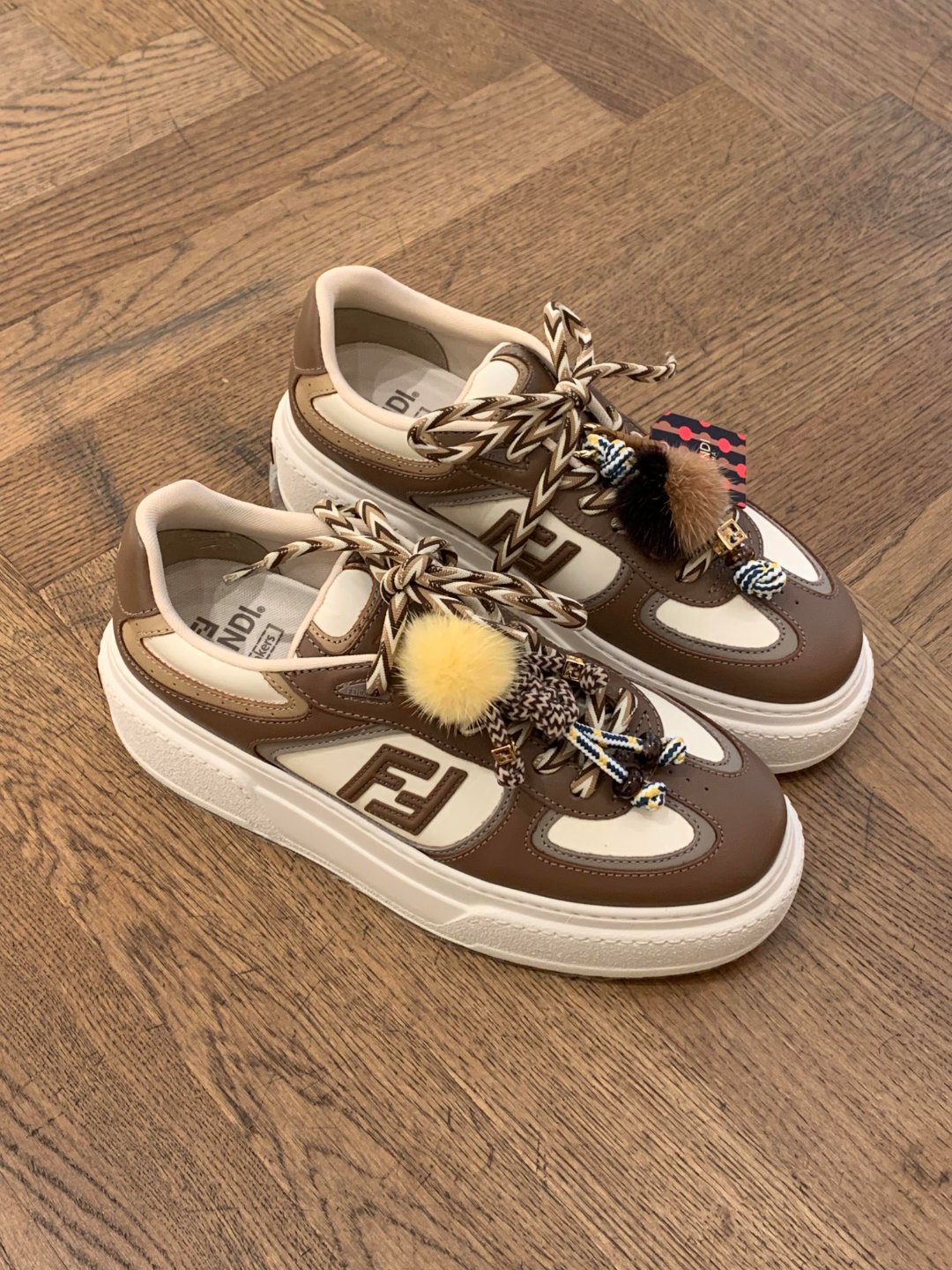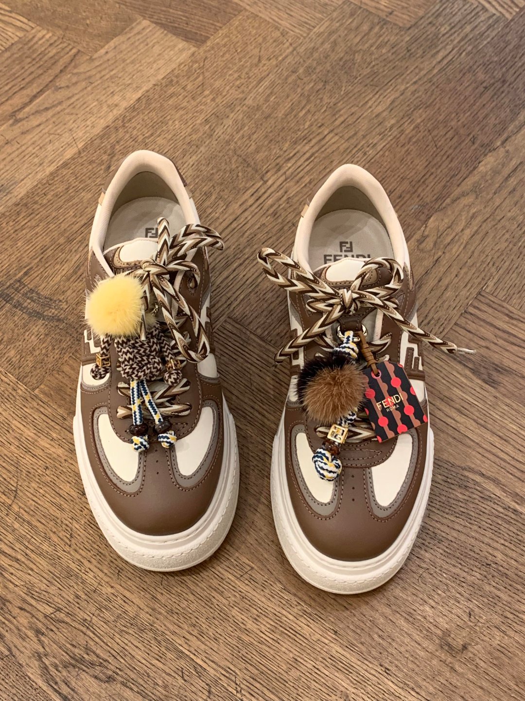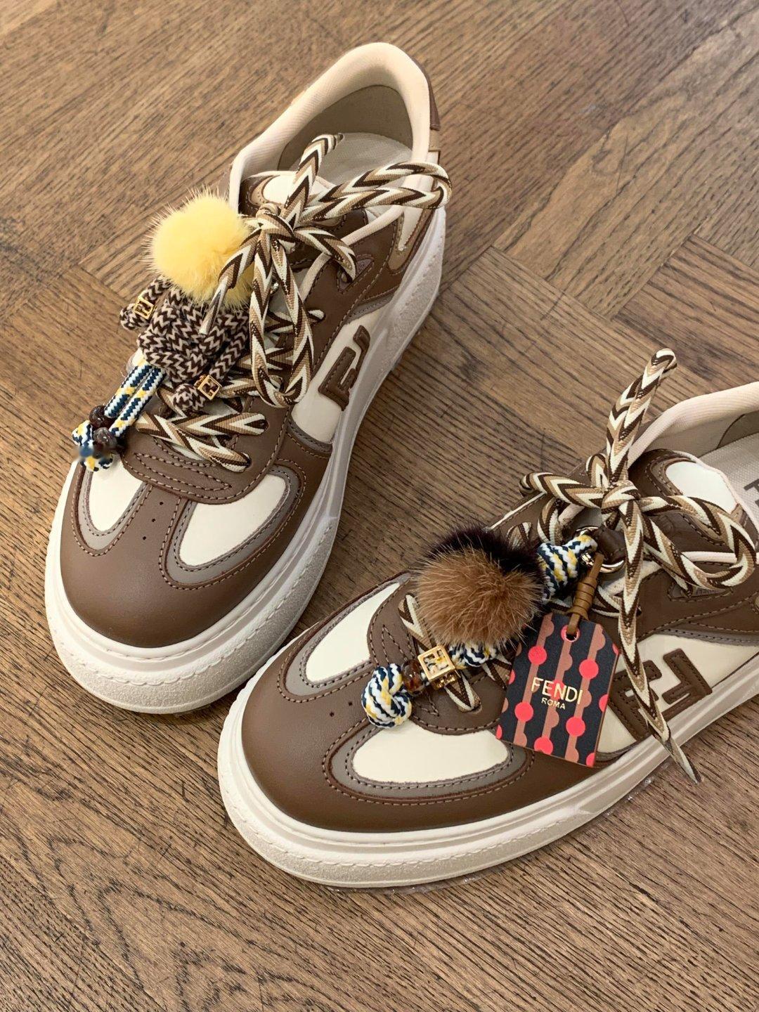 鞋身是棕白拼色+精致FF标,细节才是灵魂,貂绒玩偶扣软乎乎的,Pequin条纹吊牌自带复古质感,户外风登山绳配双色毛球,甜酷混搭还能自由DIY装饰。