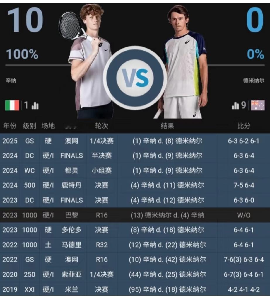 辛纳已经11连胜德米纳尔,鉴于两位球员都是当打之年,辛纳很有可能创造对阵单一球员的连胜记录。 此前男子网球对阵单一球员的连胜记录是由德约创造的,他对阵孟菲尔斯的连胜记录是20场,而孟菲尔斯已经宣布本赛季要退役了,所以这个连胜记录也不会再被改写了! 德米纳尔不可谓不强,特别是场上的跑动能力。可最为悲催的是,辛纳就像是大号的他,在任何技术上好像都高出他一筹,这也是他在辛纳那里难求一胜的最主要原因!德米纳尔要从辛纳大男仆的角色中解脱出来,需天时地利人和三者结合,缺一不可!