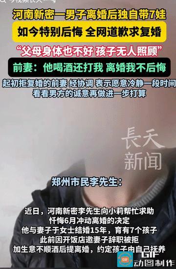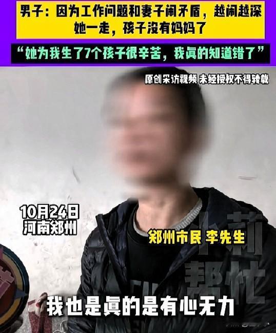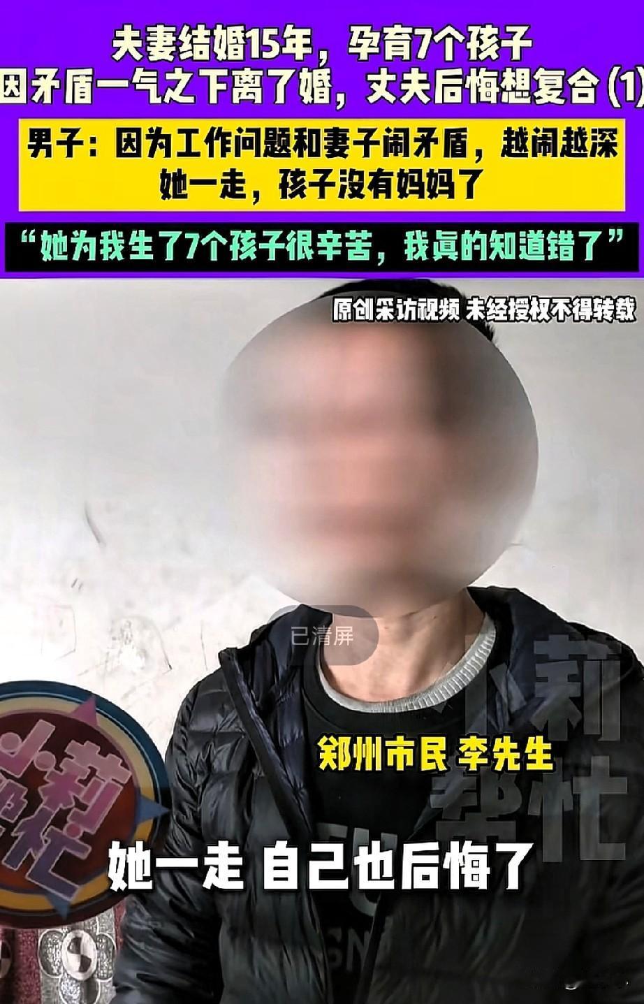 冲动的惩罚!河南,一男子离婚后独自带7个孩子,父母身体不好,孩子无人带,特别的后悔离婚了,全网道歉求复婚,网友:不是后悔,是孩子没人带了。 李先生与妻子结婚15年,育有了7个孩子,因为自己开个饭店,就让妻子辞职回来帮忙,但妻子却不愿意直接拒绝,李先生觉得自己的一家之主没有权威,又加上生意不佳,心情越来越差,还经常喝酒打骂妻子。 一次喝酒后李先生冲动之下提出了离婚,7个孩子自己独自来抚养,这不刚离婚才4个月,李先生就觉得力不从心了,父母身体不好需要照顾,孩子也没人照顾。 这个时候李先生后悔了,他想要和前妻复婚,但是都被拒了,为了能复婚,孩子有人照顾,李先生全网向前妻道歉,起初不愿意复婚的前妻,在接受调解后,表示愿意冷静一段时间,看看这个前夫的诚意,在做打算。 这个被曝光后,引起了很多网友的热议! 有的网友表示,生7个你居然敢跟老婆离婚.睡觉都得睁着眼,怕对方跑。 还有网友表示,他不是后悔离婚,而是家里的免费保姆没了。 还有网友表示,他不是发现自己错了,他是发现你走之后他的生活一地鸡毛,他又没有能力去找另一个人能接受这一地鸡毛的生活,免费保姆没了。 其实, 大多数男人都是这样,有媳妇的时候觉得自己了不起,无所不能,等到真正把媳妇气走了才发现自己狗屁都不是。 大家怎么看?不妨留下你们的看法!