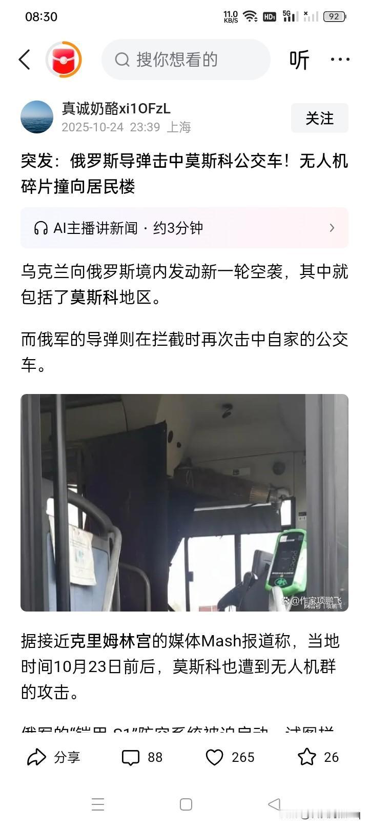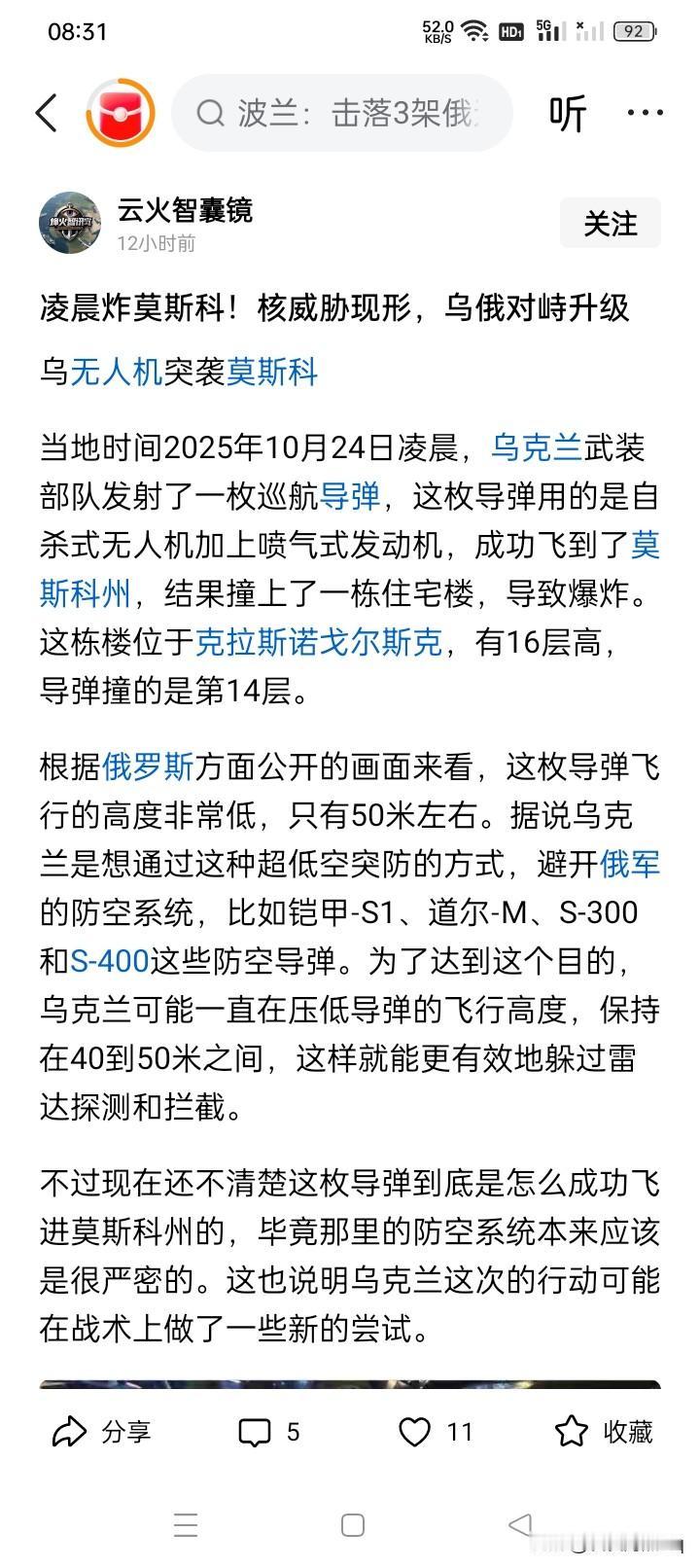 开始袭击莫斯科? 10月24日,乌克兰的无人机或导弹再次袭击了俄罗斯首都莫斯科,这次好像还使用了一枚由无人机改进、发展出来的廉价巡航导弹。 该枚导弹似乎没有击中预定目标,而是撞上了一幢住宅楼,造成五人受伤的后果。但与此同时,俄罗斯发射的“铠甲”防空导弹系统的残骸,击中了俄罗斯自己的一辆公交车,但大概没有造成人员伤亡。 值得关注的是,这次乌克兰对莫斯科地区的袭击,很可能与过去进行的短暂时间的袭击不同,因为乌克兰不仅在无人机的研制方面取得了好像很大的进展,在导弹的研制上也取得了相当程度上的进展。因此,此后乌克兰对莫斯科地区的袭击,很有可能长期化,甚至是不间断的进行。