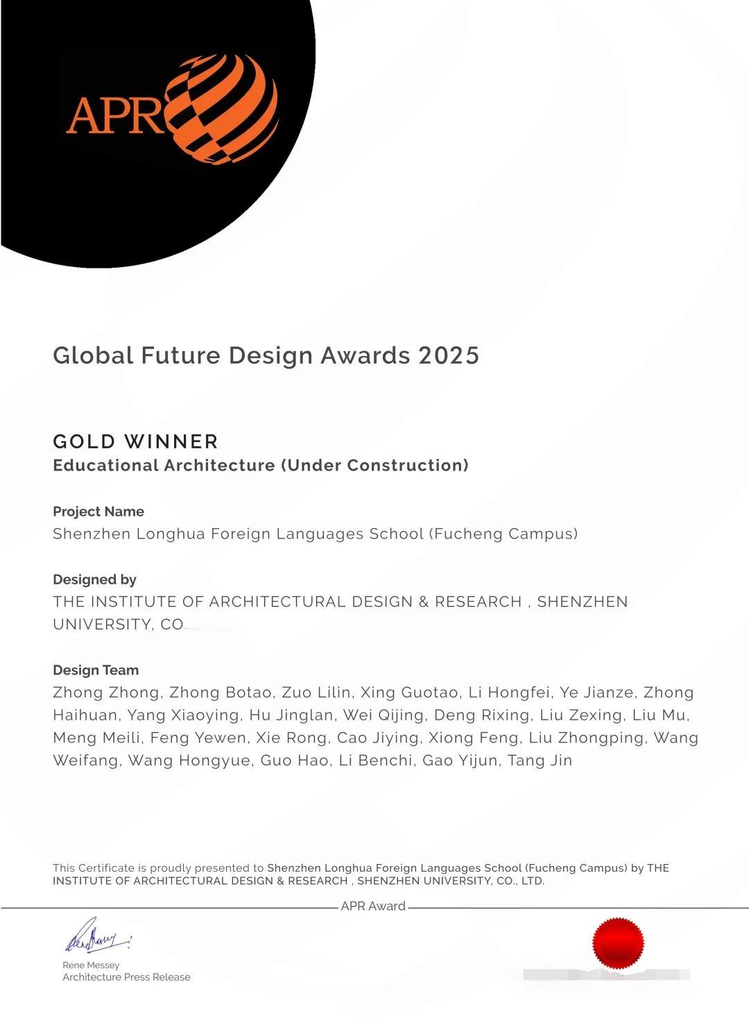 祝贺“深圳市龙华区外国语学校福城校区”(原名“田背工业区城市更新单元规划学校”即“田背学校”)获得 Global Future Design Awards 2025 全球未来设计奖 Gold Winner 教育类建筑类别金奖🥇🏆今天周末收到带项目组成员名单的获奖证书电子版[作揖][作揖][作揖]感谢深大建筑平台的支撑,感谢深大设计院 SUIADR 各专业配合和各部门支持!再次恭喜田背学校项目组全体:钟中、钟波涛、左立凛、幸国涛、李红飞、叶建泽、钟海焕、杨晓莹、胡镜澜、韦其镜、邓日星、刘泽行、刘目、孟美莉、冯叶文、谢蓉、曹继营、熊峰、刘中平、王伟方、王宏越、郭浩、李本池、高义军、唐进[玫瑰][玫瑰][玫瑰]深大建筑 深圳大学建筑设计研究院有限公司 钟中钟波涛工作室 建筑设计