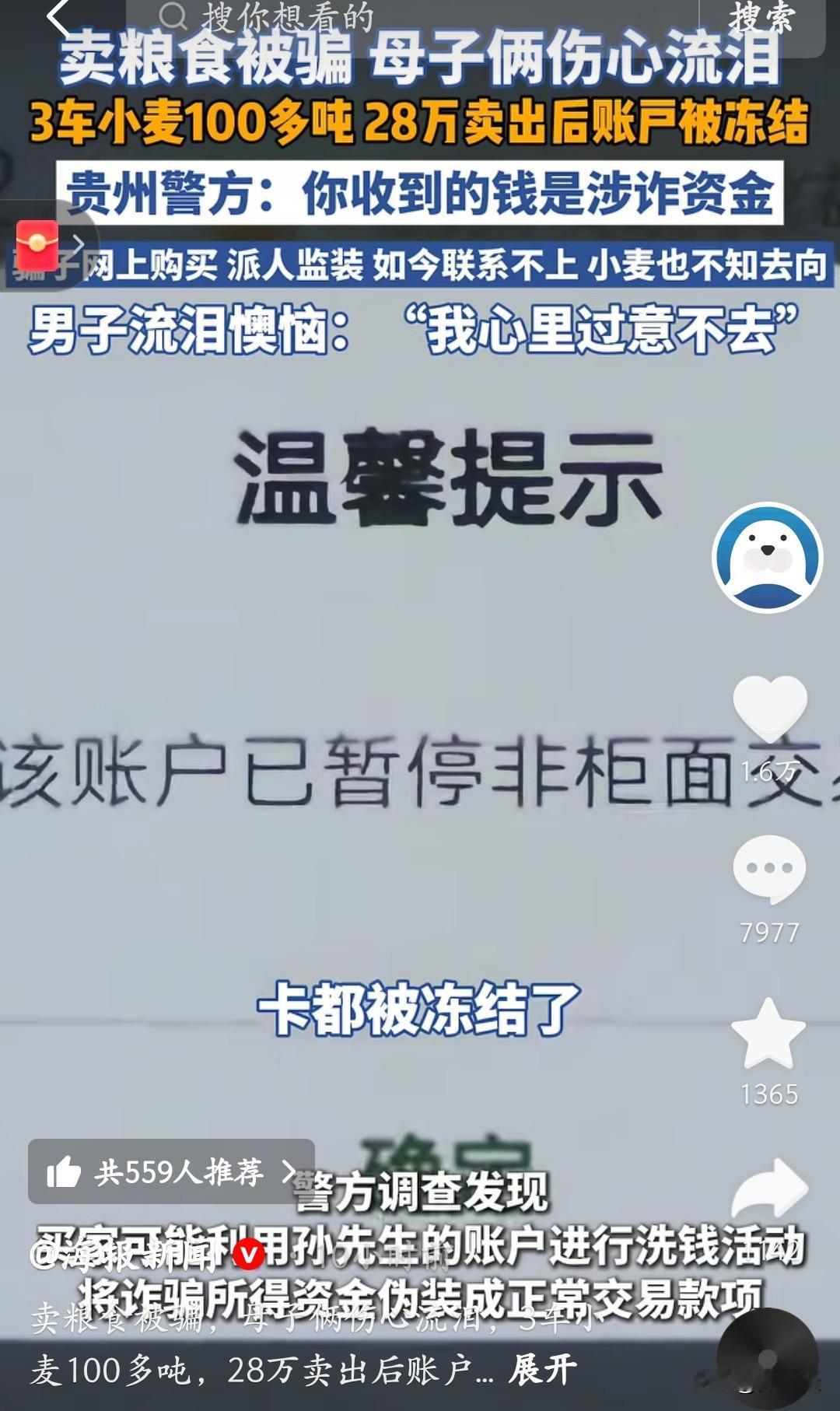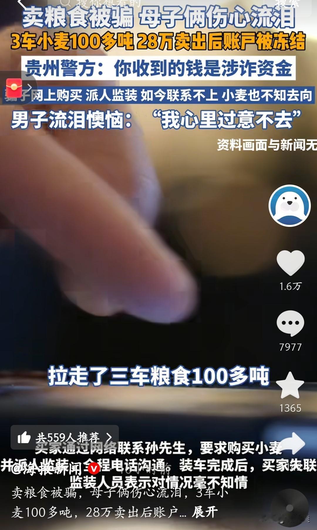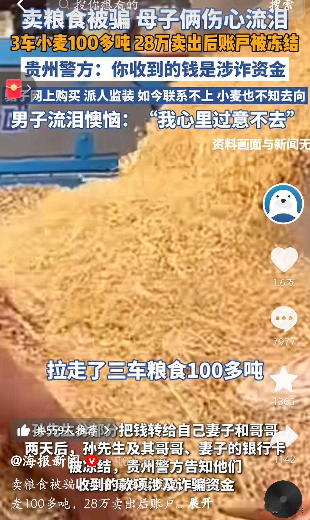 卖100吨小麦换28万,结果粮没了、钱冻了,卖粮的大哥稀里糊涂成了洗钱的“帮凶”! 河南大哥网上遇“收粮老板”,三车小麦拉走后,对方打款28万。本以为是笔好生意,结果两天后银行卡全被冻——贵州警方说这钱是诈骗赃款,买家早没影了,连监装的人都喊“不知情”。 大哥和家人哭到崩溃:粮没了,钱取不出来,生意直接卡壳。原来骗子是拿他的账户洗钱,把脏钱包装成“卖粮款”,他稀里糊涂成了“帮凶”。 这事儿看得人揪心:咱老实卖粮,咋就踩了诈骗的坑?现在警方还在查,但大哥的损失啥时候能补?