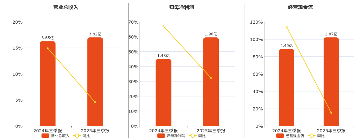 公司营业总收入为3.82亿元。归母净利润为1.96亿元。经营活动现金净流入为2.87亿元。