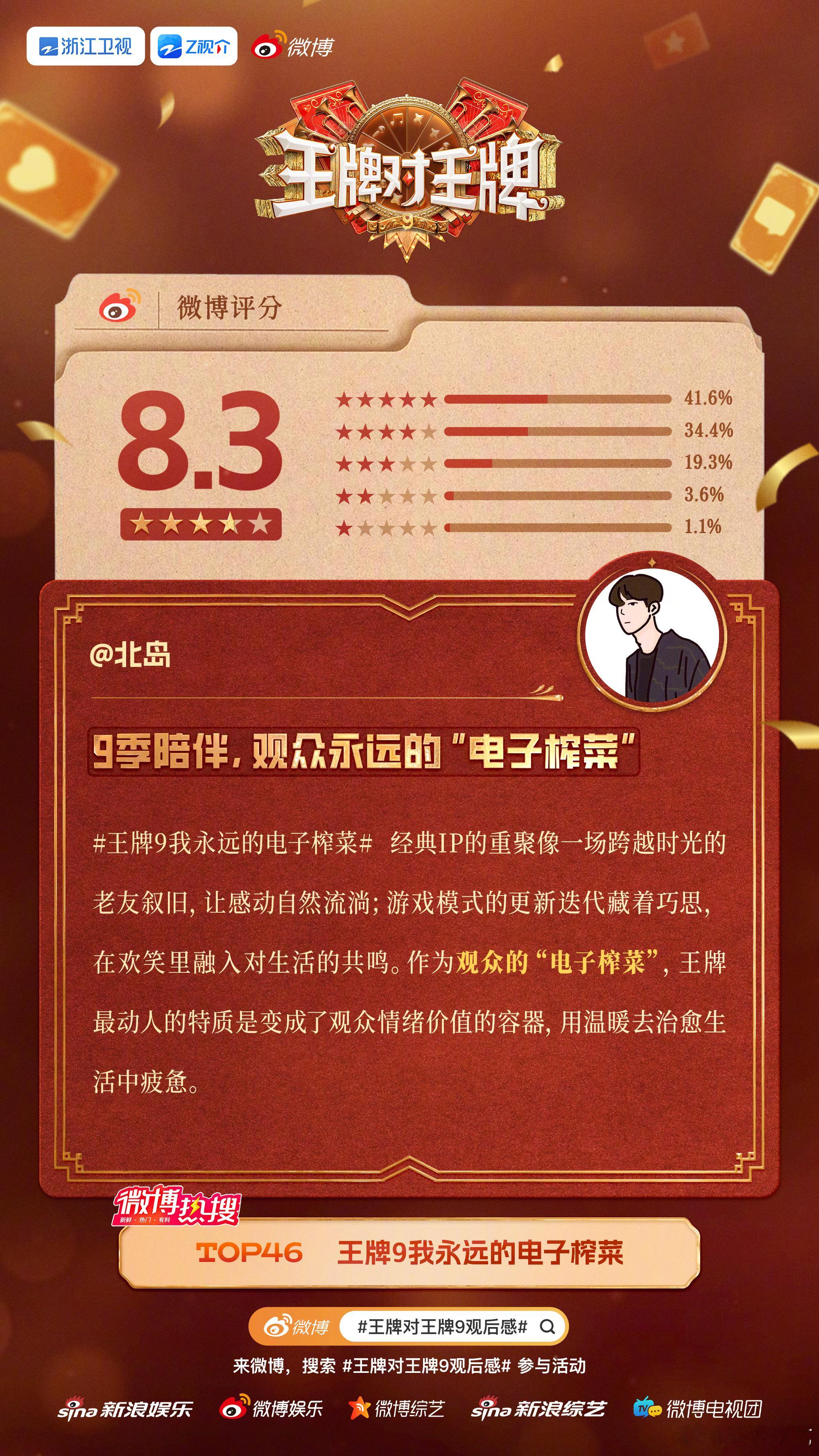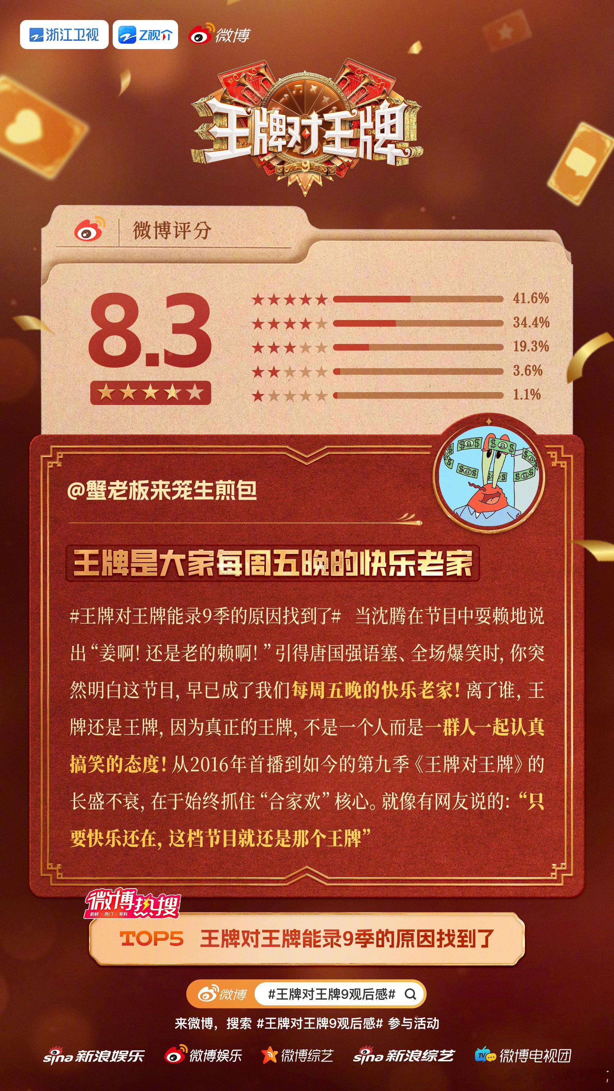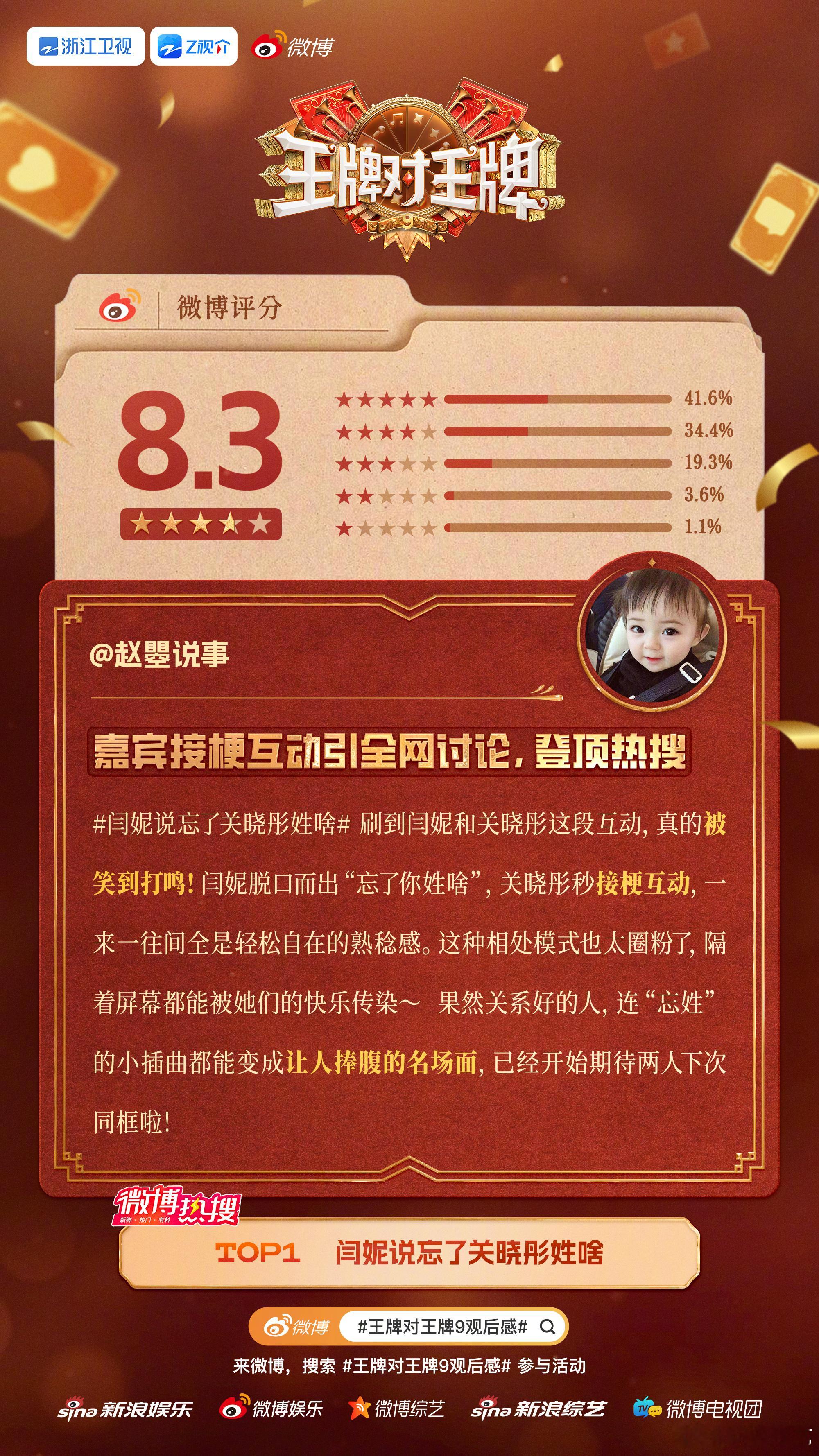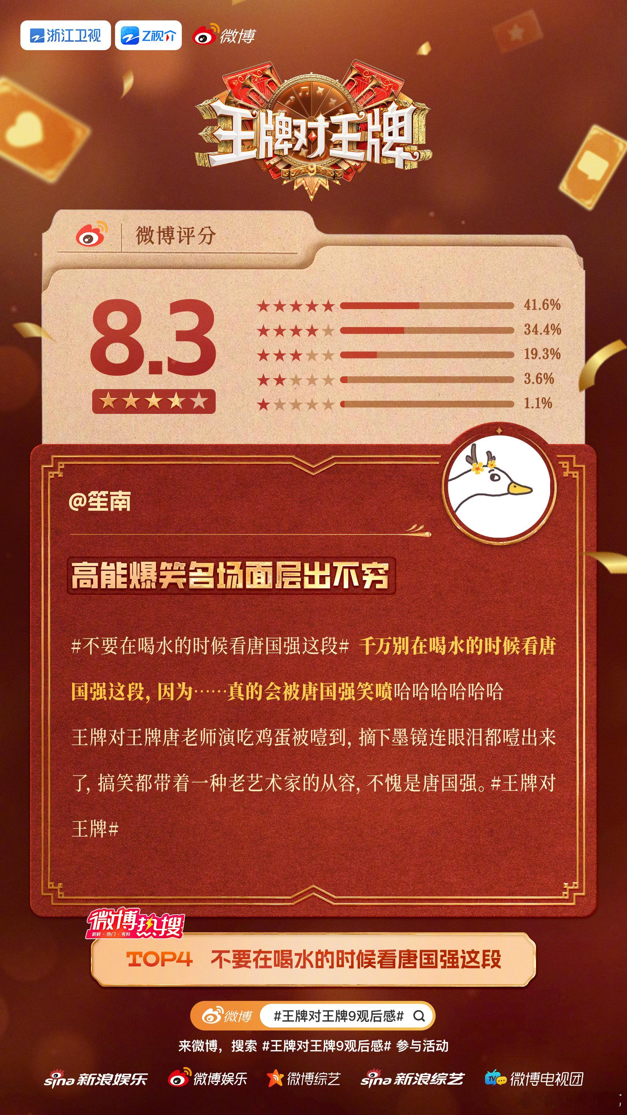 王牌对王牌9微博开分8.3 在这段互相陪伴的时光里,既有让人忍俊不禁的爆笑名场面,也有直击内心的话语治愈人心。带王牌对王牌9观后感王牌对王牌 双话题参与活动,和王牌宗族共同留存属于王牌的珍贵回忆!