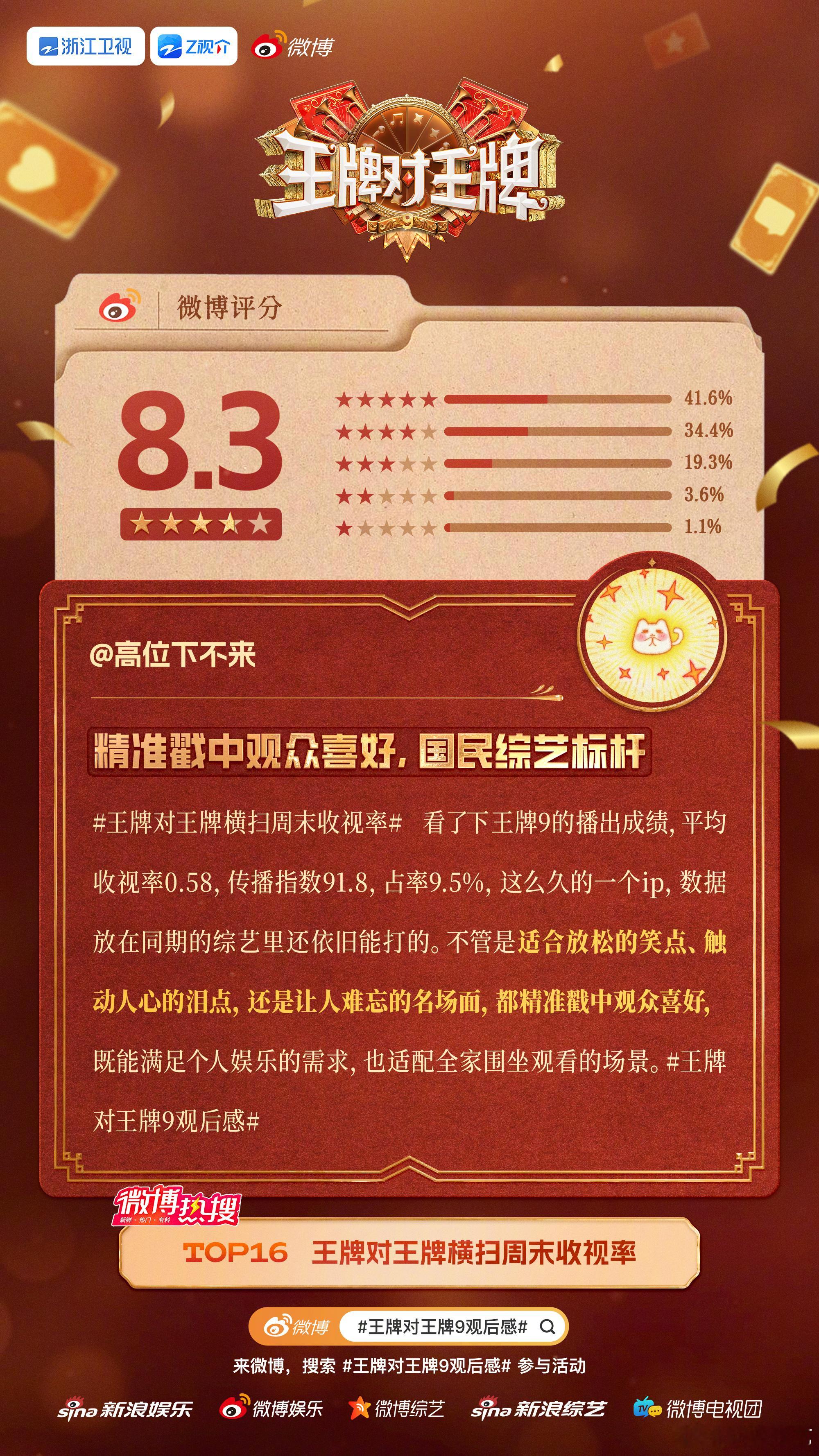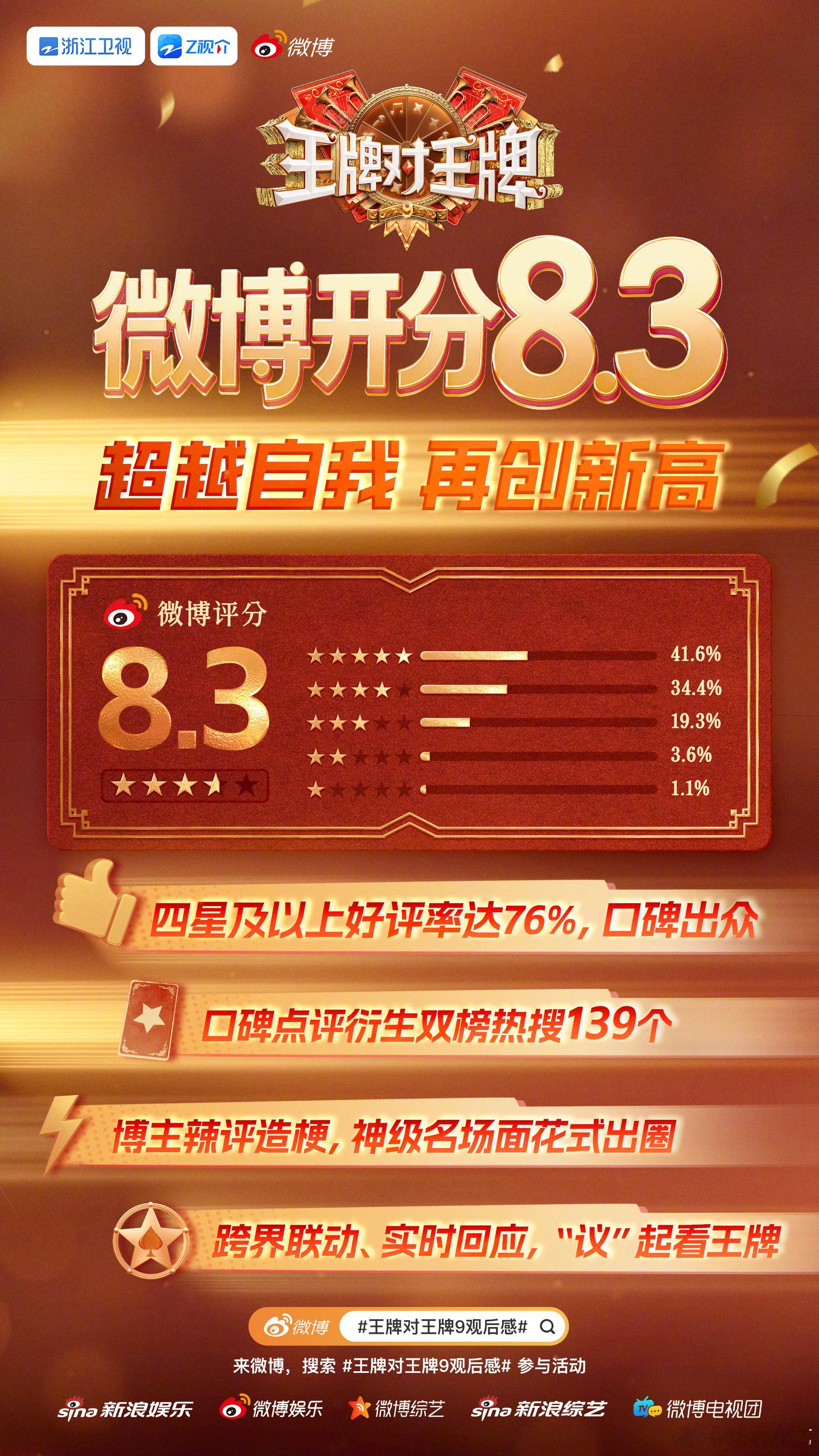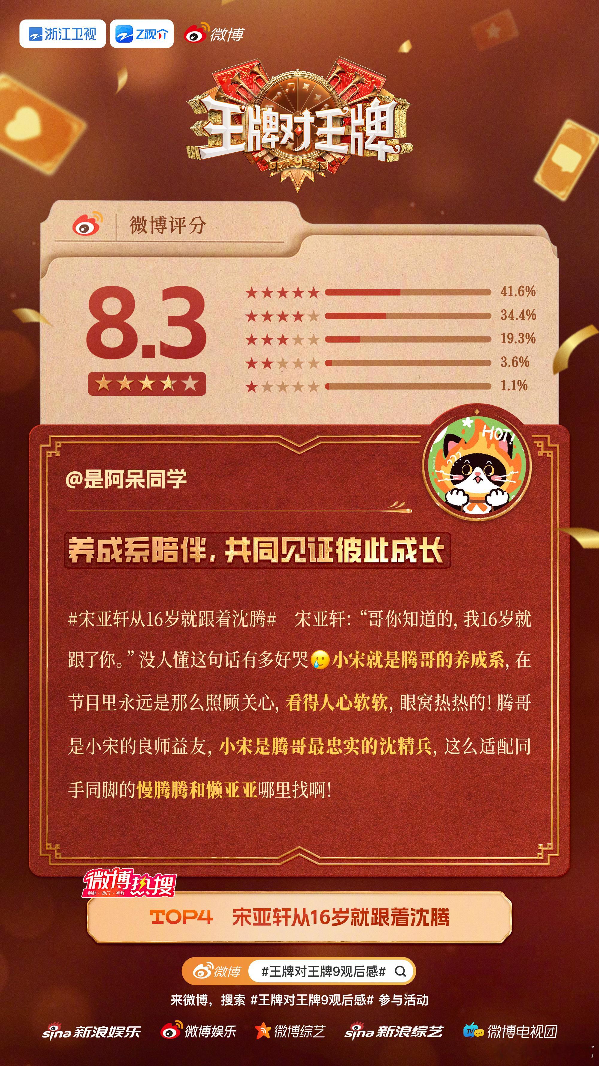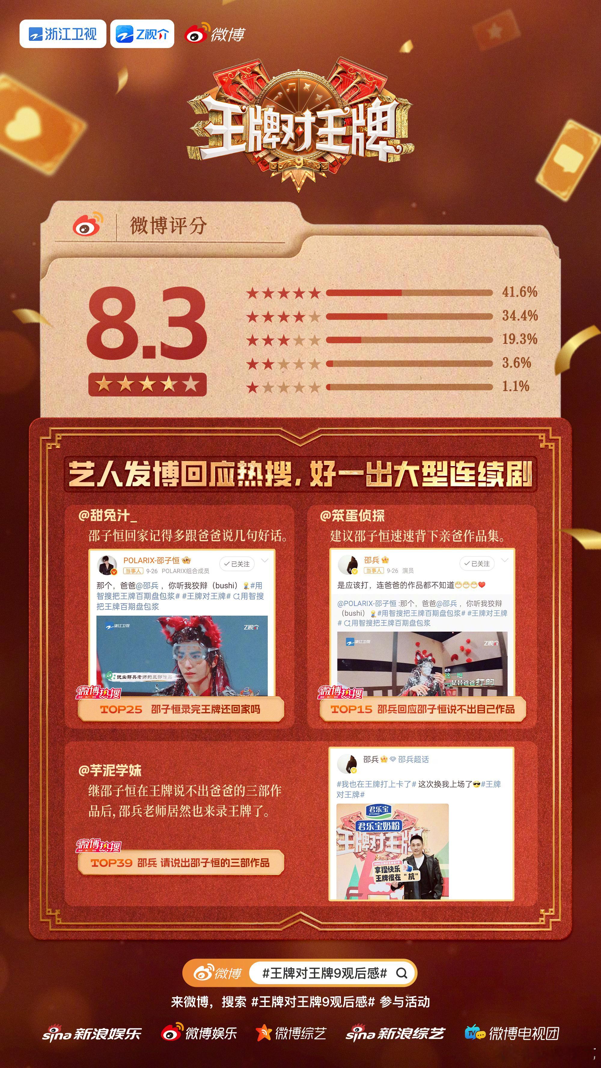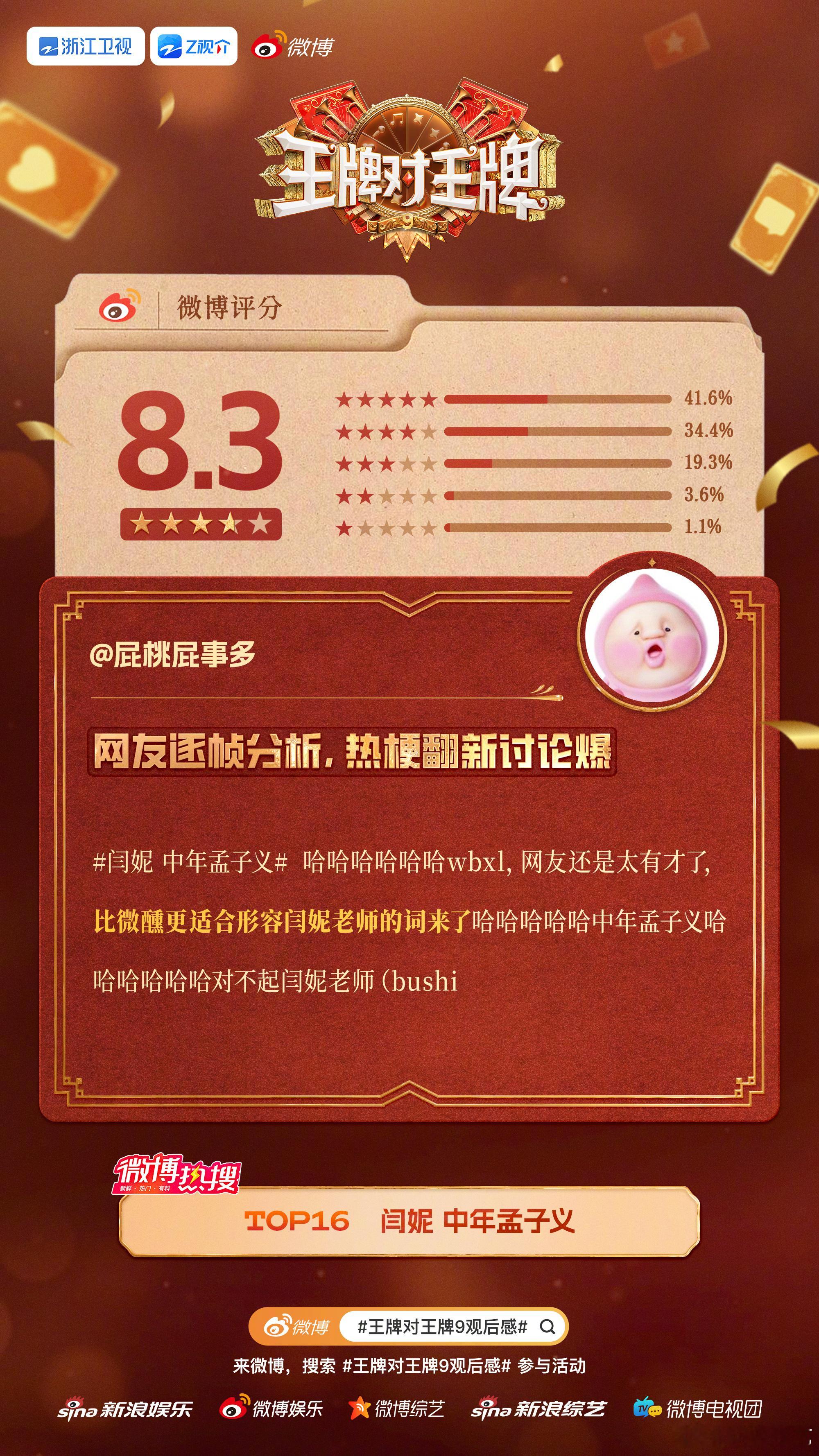 王牌对王牌9微博开分8.3 在这段互相陪伴的时光里,既有让人忍俊不禁的爆笑名场面,也有直击内心的话语治愈人心。带王牌对王牌9观后感王牌对王牌 双话题参与活动,和王牌宗族共同留存属于王牌的珍贵回忆!