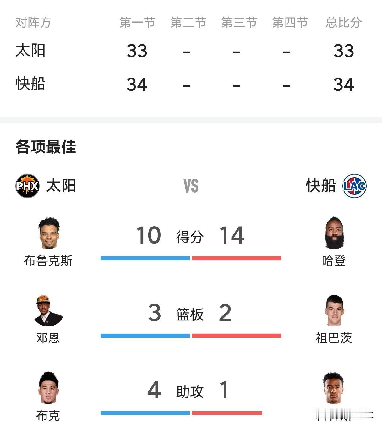 神准!哈登百发百中单节砍下14分 今天快船在主场迎战太阳,首节结束,快船以34-