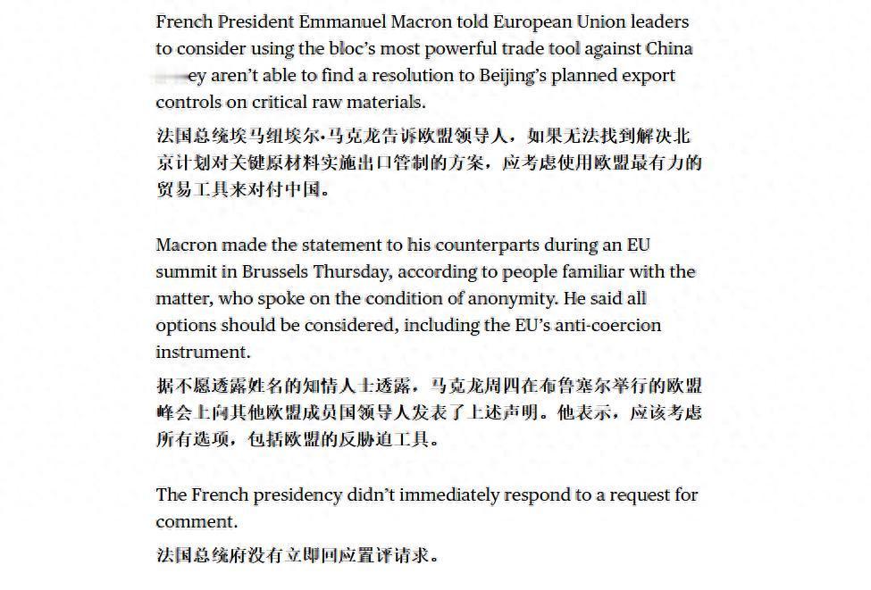 马克龙:欧盟已忍无可忍,中国再不卖稀土,就该启动“核选项”了。 10月23日布鲁塞尔欧盟峰会的闭门会议上,法国总统马克龙面对中国即将生效的稀土管制新规,他明确呼吁欧盟启动《反胁迫工具法案》这一“核选项”,直言中方的管制是“经济胁迫”,欧盟的耐心已到极限。 马克龙口中的“核选项”并不是什么新鲜事物,指的是 2023 年底正式生效的《反胁迫工具法案》,允许欧盟对目标国采取加税、限制采购、切断资本流动等极端措施,被外界冠以“贸易核弹”的名号。 然而这颗“核弹”从诞生至今从未真正引爆过。 回溯2018年特朗普政府对欧盟加征钢铝关税时,欧盟也曾高调宣称要动用这一工具,最终却在谈判桌上妥协。 俄乌冲突爆发后,面对俄罗斯的能源反制,欧盟内部再次传出启动法案的声音,结果依旧不了了之。 两次不了了之的背后,藏着同一个答案:欧盟根本承受不起法案启动后的反噬代价,这次针对中国稀土的威胁,不过是历史的重复上演。 马克龙敢喊出这话,还是没看清现实。 在欧盟的工业体系里,稀土是绕不开的关键材料。电动车的驱动电机、海上风机的核心部件、甚至战斗机的制导系统,都离不开稀土永磁材料的支撑。 现在欧盟工业里的这类材料,几乎全靠从中国进口,德国汽车工业协会的调研显示,仅2025年上半年,就有三家德国主流车企因为稀土供应延迟,不得不临时缩减电动车生产线,直接影响了近两万辆汽车的交付量。 这种依赖不是短期形成的,过去几十年里,欧盟享受着中国稀土带来的低价红利,却始终没有投入精力搭建自己的供应链,如今管制收紧就急着喊“胁迫”,未免太过双标。 欧盟不是没尝试过摆脱对中国的依赖。之前他们和加拿大、澳大利亚签了原材料合作协议,还拉着G7国家搞“稀土联盟”,想建一条“去中国化”的供应链。 德国大众甚至提前给澳大利亚一家稀土企业打了1.2亿美元,资助对方扩建工厂,结果这家工厂要到2027年才能投产,而且就算建成,提炼出来的稀土纯度也达不到高端制造的要求。 瑞典有个稀土矿因为环保评估争议,投产时间一推再推,最早也要到2035年才能用上。 更尴尬的是G7提出的“价格上限”计划,他们想给稀土定个交易价格,却发现自己根本没有定价权,全球九成以上的重稀土加工产能都在中国手里,没有中国参与的定价,不过是自说自话。 和欧盟的被动形成鲜明对比的是,中国的稀土管制不仅是对外界制裁的反制行动,也是对资源和环境的必要保护。 毕竟稀土开采和提炼对环境的破坏极大,过去几十年中国为了供应全球市场,付出了巨大的生态代价,现在规范出口流程,不过是补上资源保护的功课。 而且中国在稀土产业链上的优势,早已不只是资源本身。全球大部分稀土提纯的核心技术都握在中国手里,美国有家知名的稀土企业花了七年时间研发提纯技术,良品率还是比中国企业低三成,成本却高出不少。 这种技术优势不是靠封锁得来的,而是长期投入研发的结果,欧盟想绕过中国建立供应链,光有资源没有技术,根本行不通。 对于马克龙的放话,德国总理默茨虽然表面上说可以讨论,背地里德国企业正忙着和中国稀土企业签长期合同,巴斯夫更是直接警告政府,要是真启动“核选项”,他们的化工生产线可能会因为供应链中断而停工。 匈牙利、希腊这些东欧国家的态度更明确,他们常年接受中国投资,清楚和中国对抗没有好处,根本不愿意为了法国的政治野心牺牲自己的利益。 要知道,《反胁迫工具法案》的启动需要所有欧盟成员国达成共识,现在这种四分五裂的状态,马克龙的“核选项”不过是喊给外人听的口号。 再看看其他国家的做法,就更能明白中国的管制合情合理。澳大利亚作为铁矿石出口大国,曾经也对铁矿石出口进行过规范管理,没见哪个国家说这是“经济胁迫”;沙特等中东国家调控石油产量,也是维护自身利益的正常操作。 资源出口国根据自身情况调整政策,本就是国际通行的规则,欧盟之所以反应这么激烈,本质上是习惯了过去的低价供应,不愿接受市场规则的变化。 中国商务部早就说得很清楚,管制不是要断供,符合规定的欧盟企业依然能享受到审批便利。 这意味着合作的大门一直开着,只是欧盟需要放下“胁迫”的帽子,回到规则框架内对话。 马克龙应该清楚,“核选项”喊得再响,也改变不了欧盟依赖中国稀土的现实,真要按下启动键,受损的只会是欧盟自己的工业和就业。