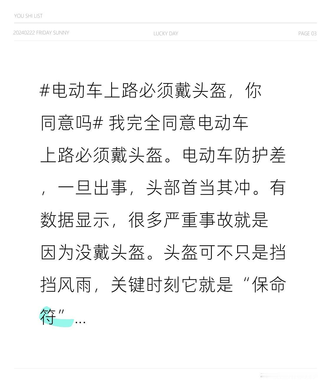 我完全同意电动车上路必须戴头盔。电动车防护差,一旦出事,头部首当其冲。有数据显示,很多严重事故就是因为没戴头盔。头盔可不只是挡挡风雨,关键时刻它就是“保命符”,能缓冲撞击、降低颅脑损伤风险。 有人嫌戴头盔麻烦,觉得没必要,可跟脑袋受伤后的痛苦和家庭负担比起来,这点不便根本不算啥。强制戴头盔不是限制自由,而是用低成本保障安全。国家也该完善立法,各地推进落实,让戴头盔成为骑行者的自觉习惯,这样上路才能平平安安。
