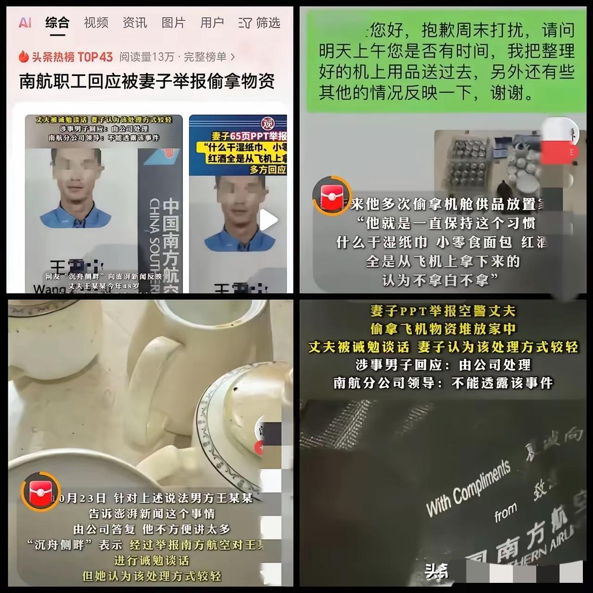这女的也太绝了[捂脸] 因为离婚条件没有谈拢,她将当空警的丈夫给举报了,她花了半年多时间,做了一份65页的图文PPT,列出了丈夫多年来从飞机上顺手牵羊带回家里的生活用品和吃的东西,那水杯、毛巾都印着航司标识,刀叉碗碟刻着机组专用,连零食红酒都是航班专供款 没人知道这半年她是怎么熬过来的。朋友说,之前两口子吵架时,她就提过丈夫总往家带“航司的东西”,当时以为只是拿个一次性水杯、几包小饼干,没当回事,直到离婚谈崩,她才翻出藏在柜子最里面的箱子——里面全是丈夫这些年攒下的“战利品”。光是整理这些东西,她就花了快一个月,每一件都用便签标着“某年某月某航班带回”,连哪次飞的是国内线、哪次是国际线都记着,生怕漏了一个细节。 做PPT的时候更较真,她专门学了基础的排版,给每个物品都拍了高清照片,正面、侧面、印着标识的地方都拍得清清楚楚,旁边还附上文字说明:“某航司机组专用毛巾,2022年3月丈夫执飞XX航线后带回”“航班专供红酒,瓶身有航司logo,未开封,2021年11月发现于书房柜中”。65页的内容,没有一句废话,全是实打实的证据,连办案人员看了都感慨“太细致了,像是做项目报告”。 其实她一开始没想着举报,毕竟夫妻一场。据知情人说,两人结婚五年,前几年还挺和睦,后来丈夫总以“工作忙”晚归,回家也很少说话,慢慢就有了隔阂。谈离婚时,丈夫不仅不愿分割共同财产,还说她“在家不挣钱,没资格要补偿”,这话彻底戳中了她的底线。她才想起那些年丈夫带回家的“小东西”——刚开始是水杯、毛巾,后来变成刀叉、碗碟,甚至有一次还拎回了一整箱航班专供的坚果,当时她劝过“这是公司的东西,别拿”,丈夫却满不在乎“大家都拿,没人管”。 谁能想到,这些看似不值钱的“顺手牵羊”,其实早触了线。空警的职责是维护航班安全、保障乘客和航司利益,可她丈夫倒好,把工作场合当成了“免费超市”,专拿带航司标识的专用物品。这些东西单个看不贵,但积少成多,已经属于侵占企业财物;更关键的是,机组专用物品有严格的管理规定,少一件就可能影响航班正常保障,比如少一套刀叉,后续航班的餐具配备就可能不足,看似小事,实则藏着安全隐患。 这事曝光后,航司很快就成立了调查组,不仅查她丈夫,还顺带着查了同机组的其他人员。有业内人士透露,航司对这类行为零容忍,一旦查实,轻则记大过、扣绩效,重则开除,要是涉及金额多,还可能被追究法律责任。而她丈夫呢,原本好好的工作,就因为贪小便宜毁了,连带着名声也臭了——谁能想到,一个本该守护秩序的空警,会栽在“偷拿水杯毛巾”上。 有人说她“太狠了,离婚而已没必要赶尽杀绝”,也有人说“是她丈夫先做错,贪小便宜在前,不尊重妻子在后,活该”。其实说到底,婚姻里的矛盾总有解决的办法,但拿工作纪律当儿戏、用侵占财物满足私欲,本身就站不住脚;而用举报的方式了断,虽然解气,却也把两人最后一点情分撕得干干净净。 各位读者你们怎么看?欢迎在评论区讨论。