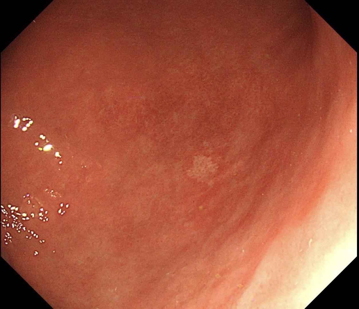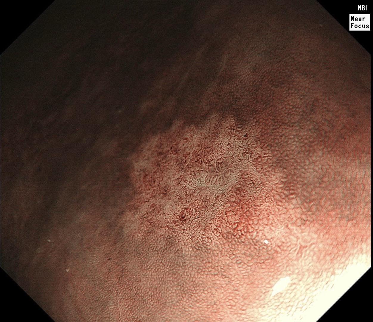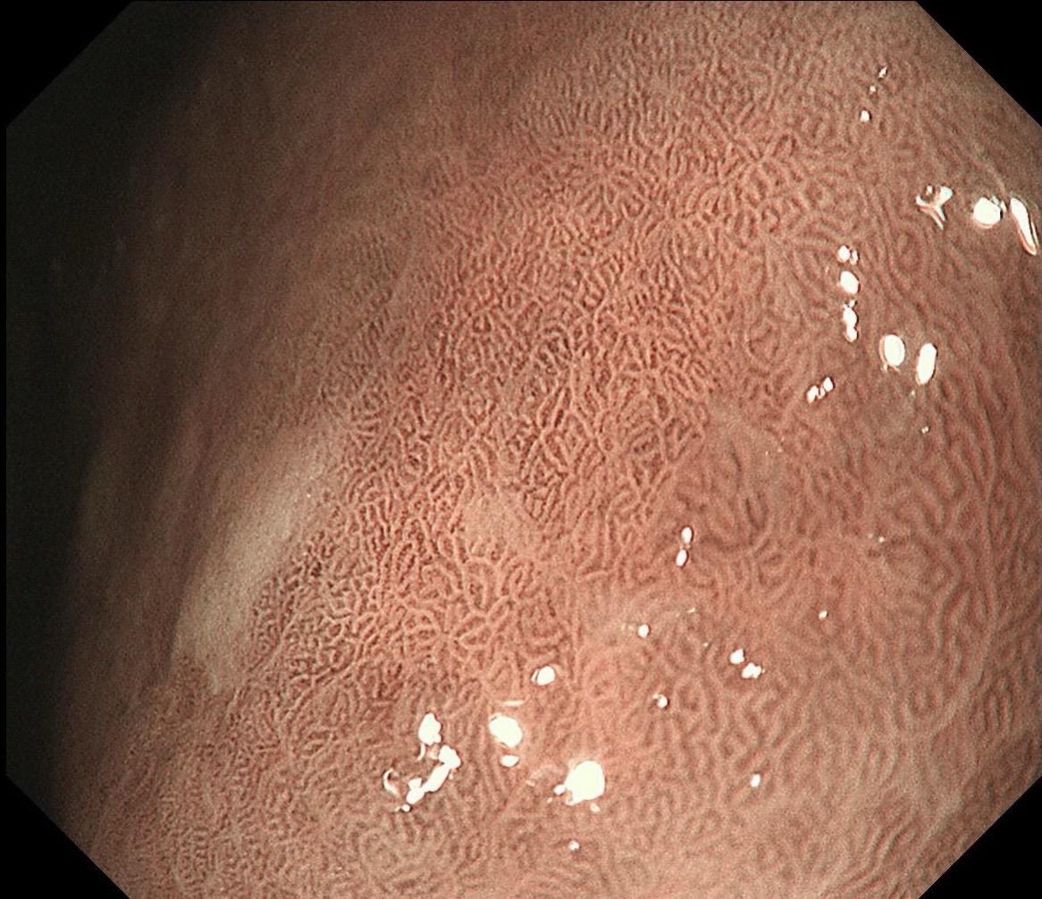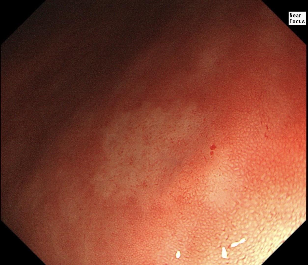 男,40岁,胃双发褪色调病变。慢性胃炎复查,3年前胃镜未见异常,Hp阳性背景,萎缩不明显,胃体下部大弯见一褪色调病变,浅凹陷,5mm左右,换用放大内镜观察,表面结构缺失,血管异型明显,未分化可能性大……胃窦后壁见一白斑,无高度差,NBI浅茶色,放大草草看了下,似有边界,IP增宽,活检待病理……小哥哥胖得几乎没脖子,腹式呼吸太明显~😖