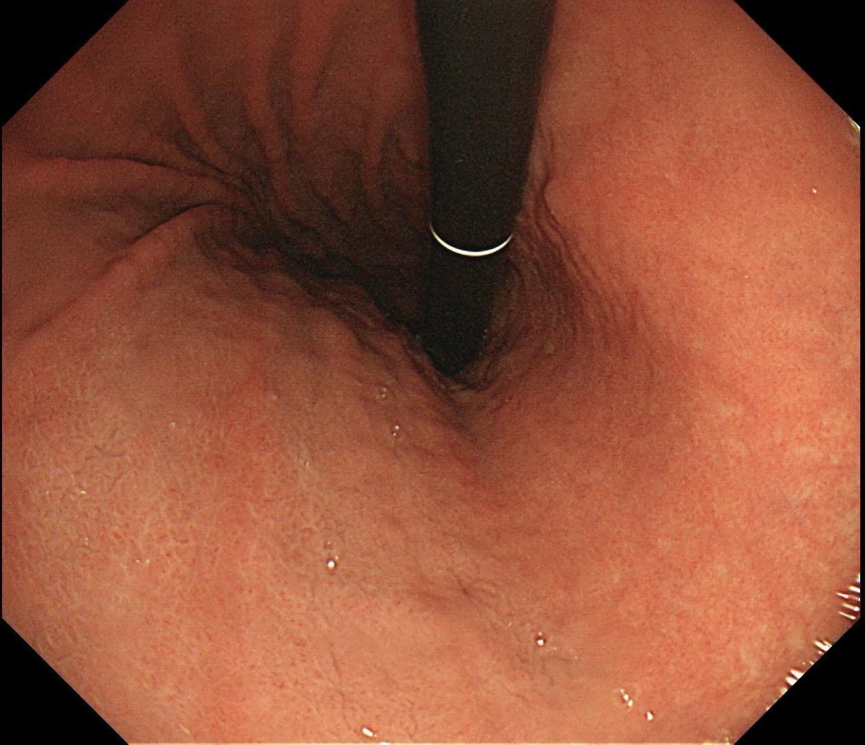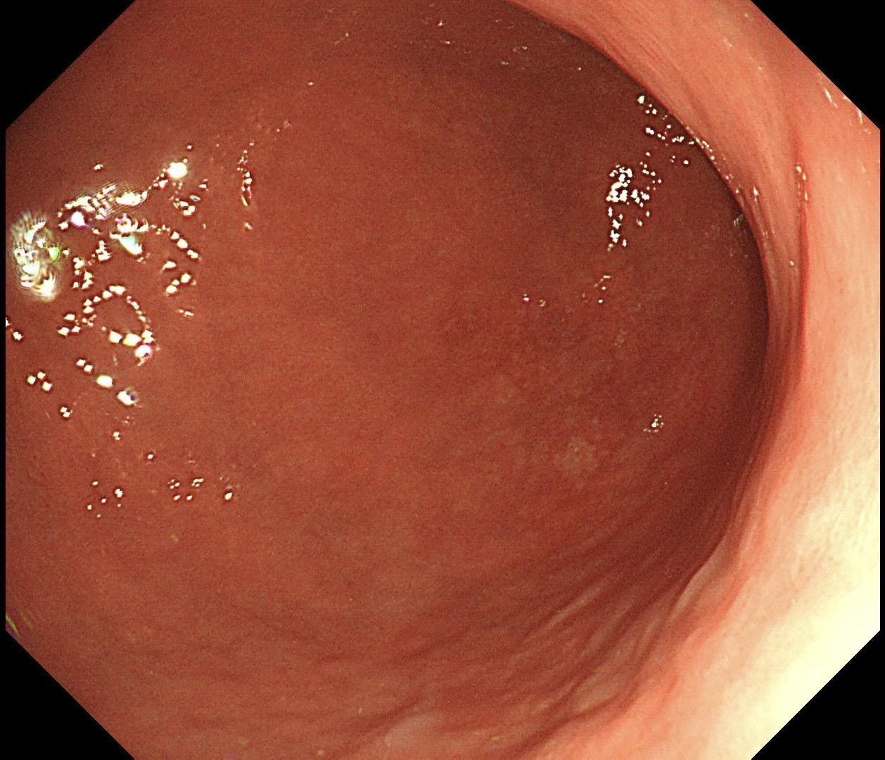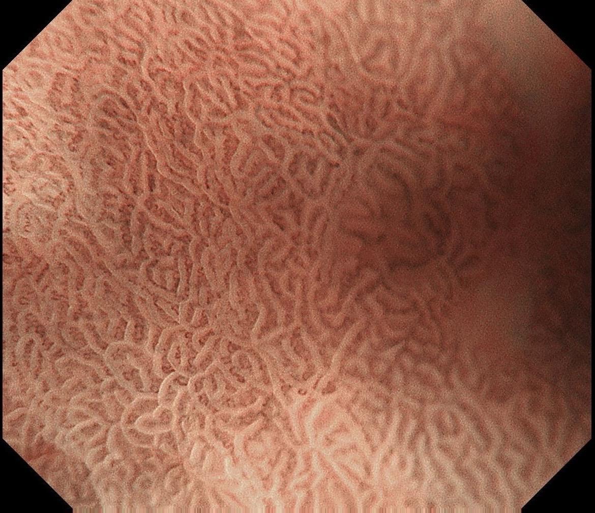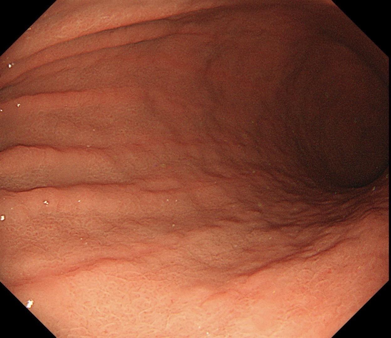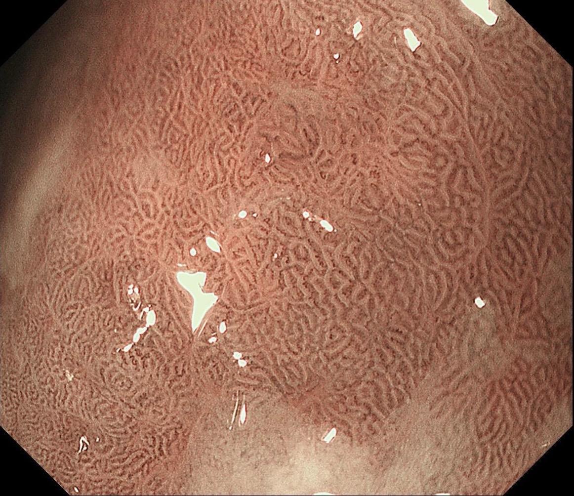 男,40岁,胃双发褪色调病变。慢性胃炎复查,3年前胃镜未见异常,Hp阳性背景,萎缩不明显,胃体下部大弯见一褪色调病变,浅凹陷,5mm左右,换用放大内镜观察,表面结构缺失,血管异型明显,未分化可能性大……胃窦后壁见一白斑,无高度差,NBI浅茶色,放大草草看了下,似有边界,IP增宽,活检待病理……小哥哥胖得几乎没脖子,腹式呼吸太明显~😖